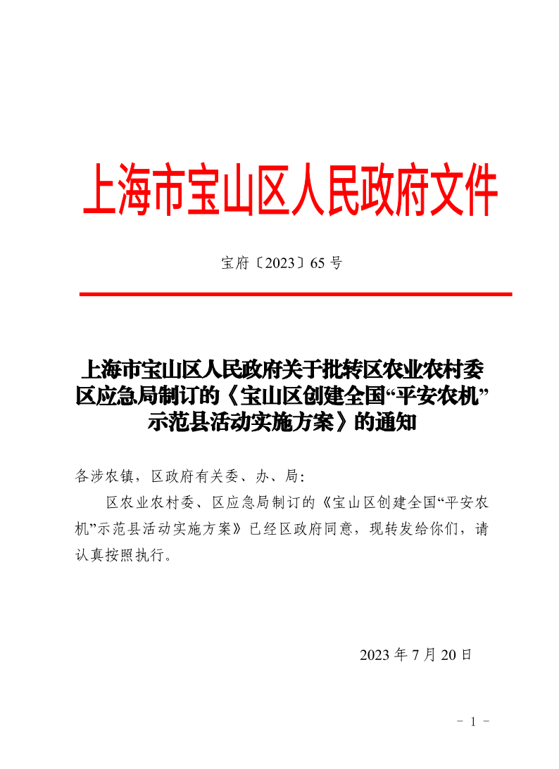 区农业农村委、区应急局制订的《宝山区创建全国“平安农机”示范县活动实施方案》已经区政府同意,现转发给你们,请认真按照执行。