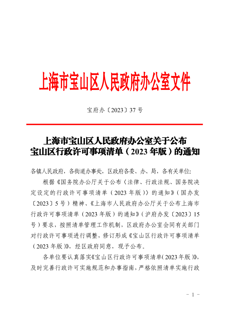 上海市宝山区人民政府办公室关于公布宝山区行政许可事项清单(2023年版)的通知