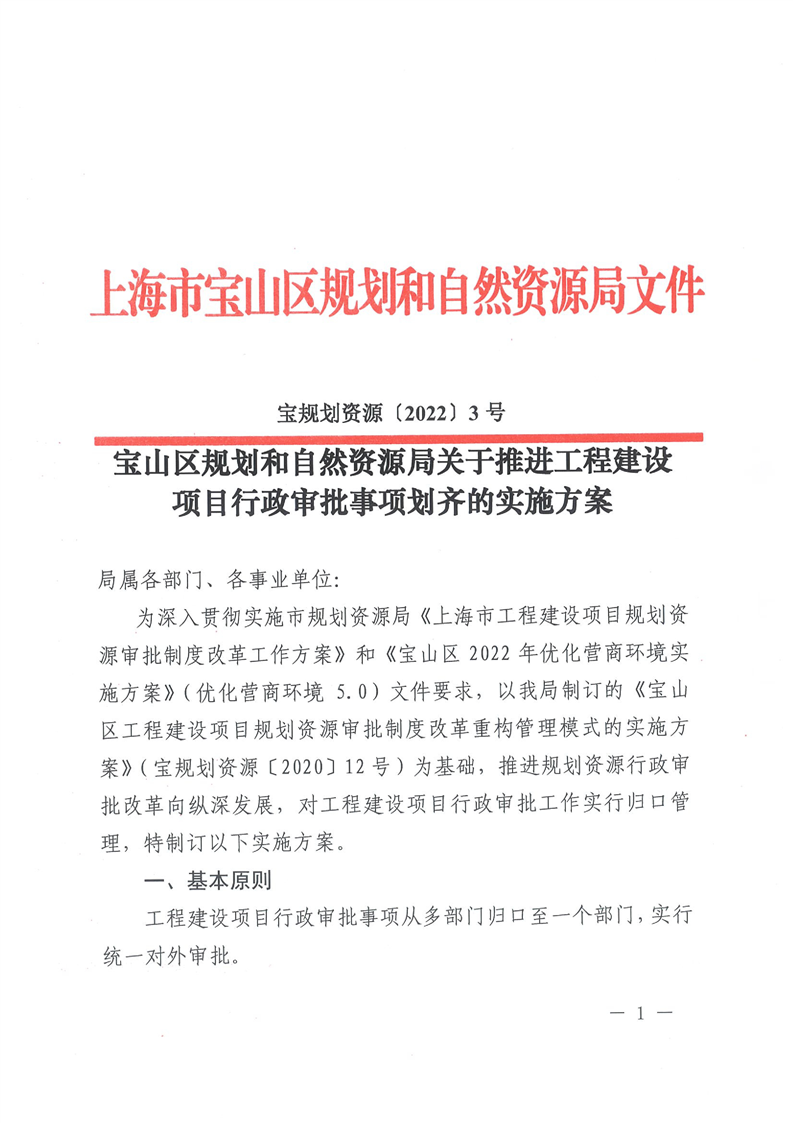 宝山区规划和自然资源局关于推进工程建设项目行政审批事项划齐的实施方案
