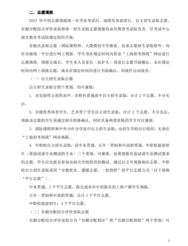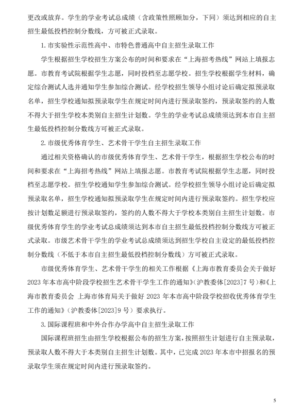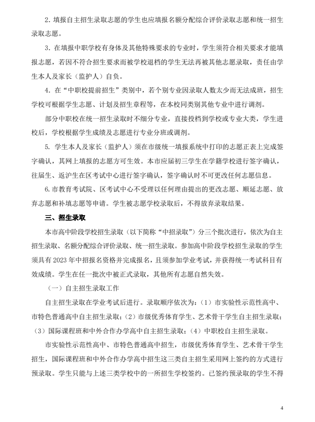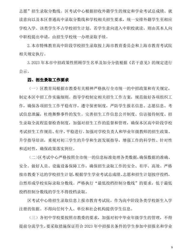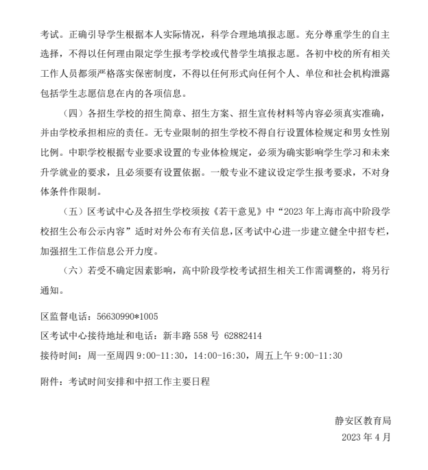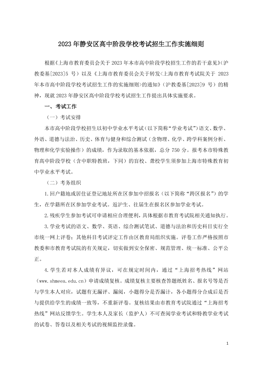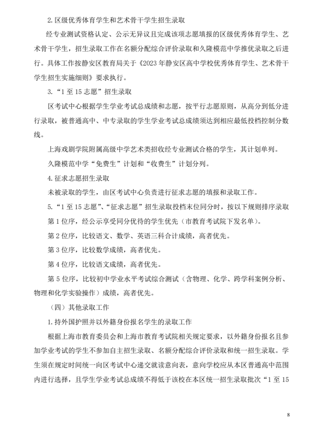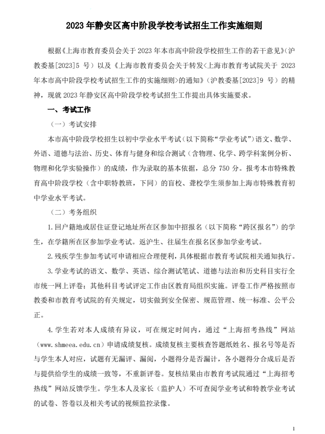 2023年静安区高中阶段学校考试招生工作实施细则