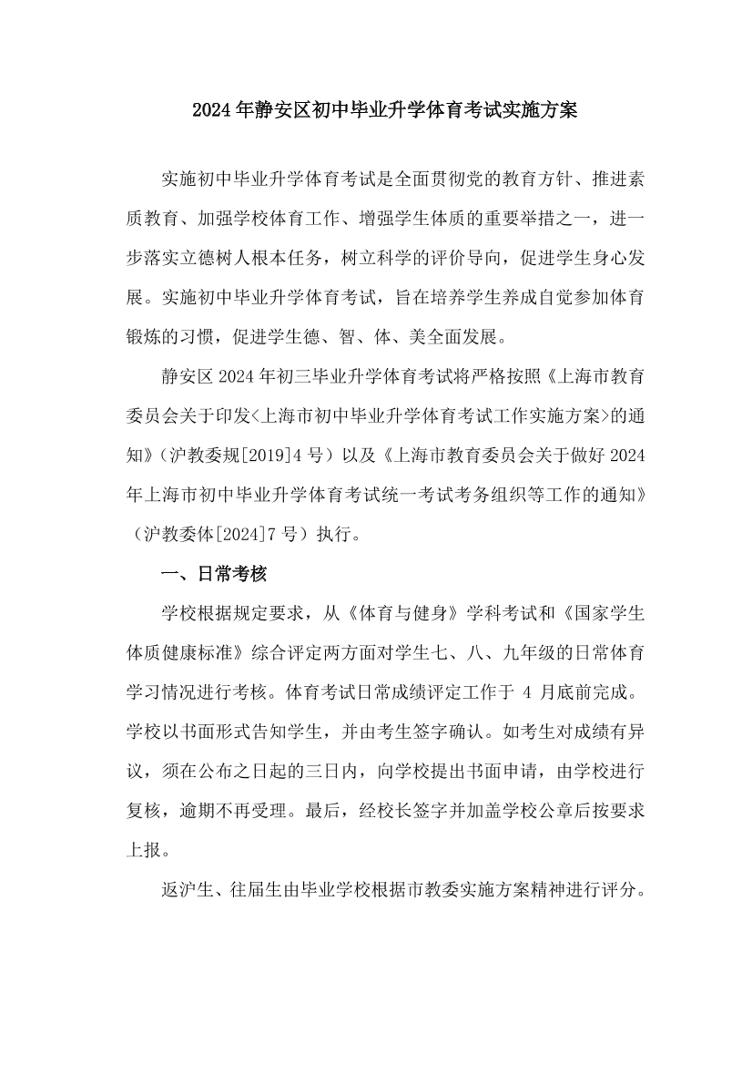 静安区2024年初三毕业升学体育考试将严格按照《上海市教育委员会关于印发<上海市初中毕业升学体育考试工作实施方案>的通知》(沪教委规[2019]4号)以及《上海市教育委员会关于做好2024年上海市初中毕业升学体育考试统一考试考务组织等工作的通知》(沪教委体[2024]7号)执行。