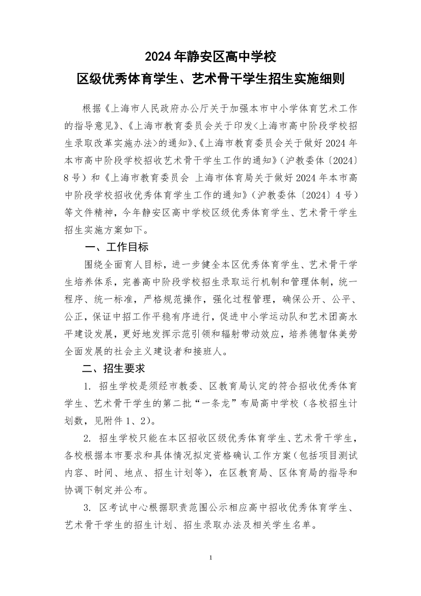 根据《上海市人民政府办公厅关于加强本市中小学体育艺术工作的指导意见》、《上海市教育委员会关于印发<上海市高中阶段学校招生录取改革实施办法>的通知》、《上海市教育委员会关于做好2024年本市高中阶段学校招收艺术骨干学生工作的通知》(沪教委体〔2024〕8号)和《上海市教育委员会 上海市体育局关于做好2024年本市高中阶段学校招收优秀体育学生工作的通知》(沪教委体〔2024〕4号)等文件精神,今年静安区高中学校区级优秀体育学生、艺术骨干学生招生实施方案如下。