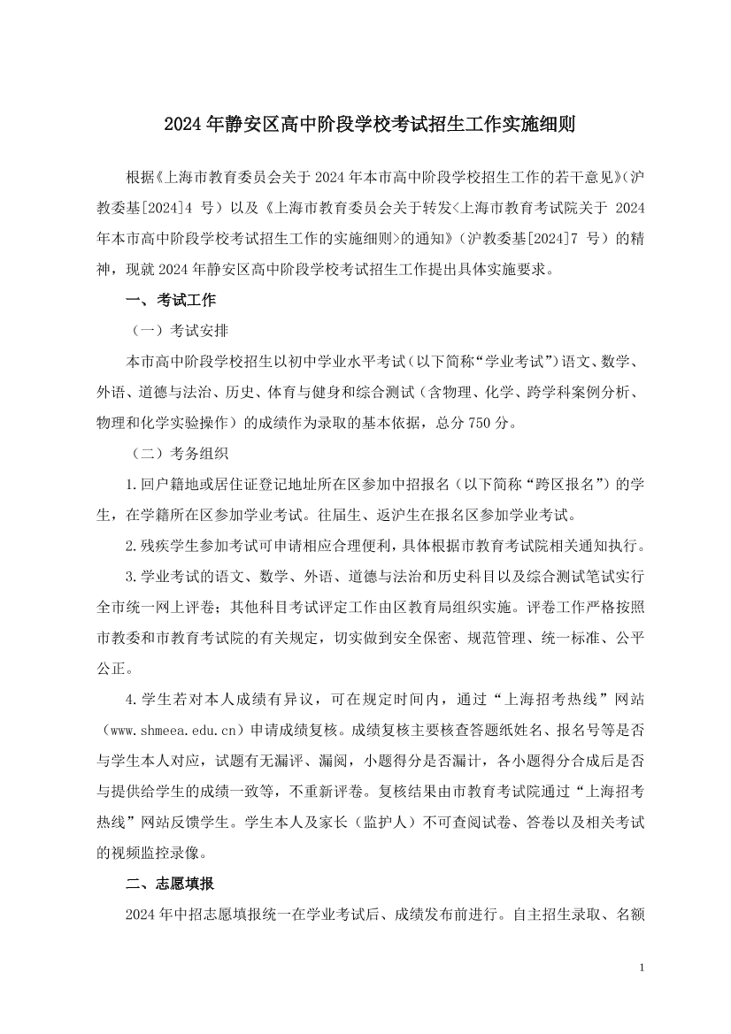 根据《上海市教育委员会关于2024年本市高中阶段学校招生工作的若干意见》(沪教委基[2024]4号)以及《上海市教育委员会关于转发<上海市教育考试院关于2024年本市高中阶段学校考试招生工作的实施细则>的通知》(沪教委基[2024]7号)的精神,现就2024年静安区高中阶段学校考试招生工作提出具体实施要求。