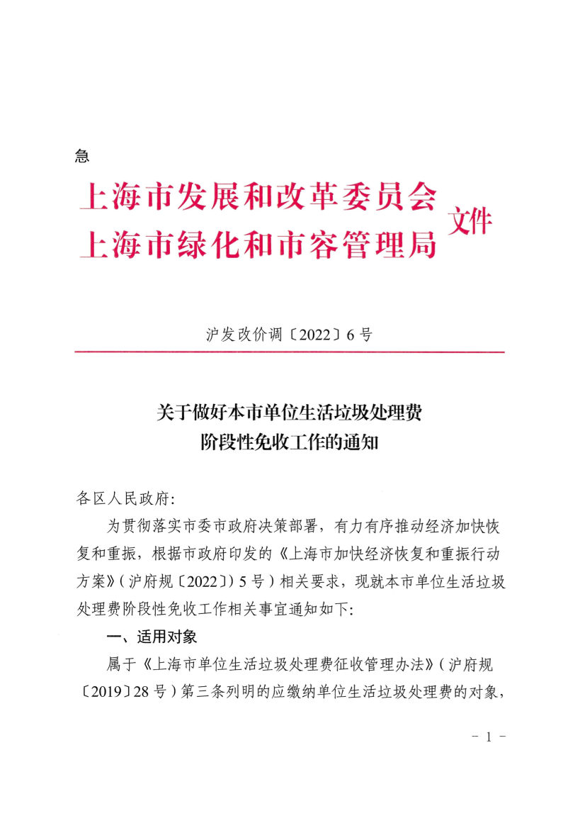 为贯彻落实市委市政府决策部署,有力有序推动经济加快恢复和重振,根据市政府印发的《上海市加快经济恢复和重振行动方案》(沪府规〔2022〕)5号)相关要求,现就本市单位生活垃圾处理费阶段性免收工作相关事宜通知如下: