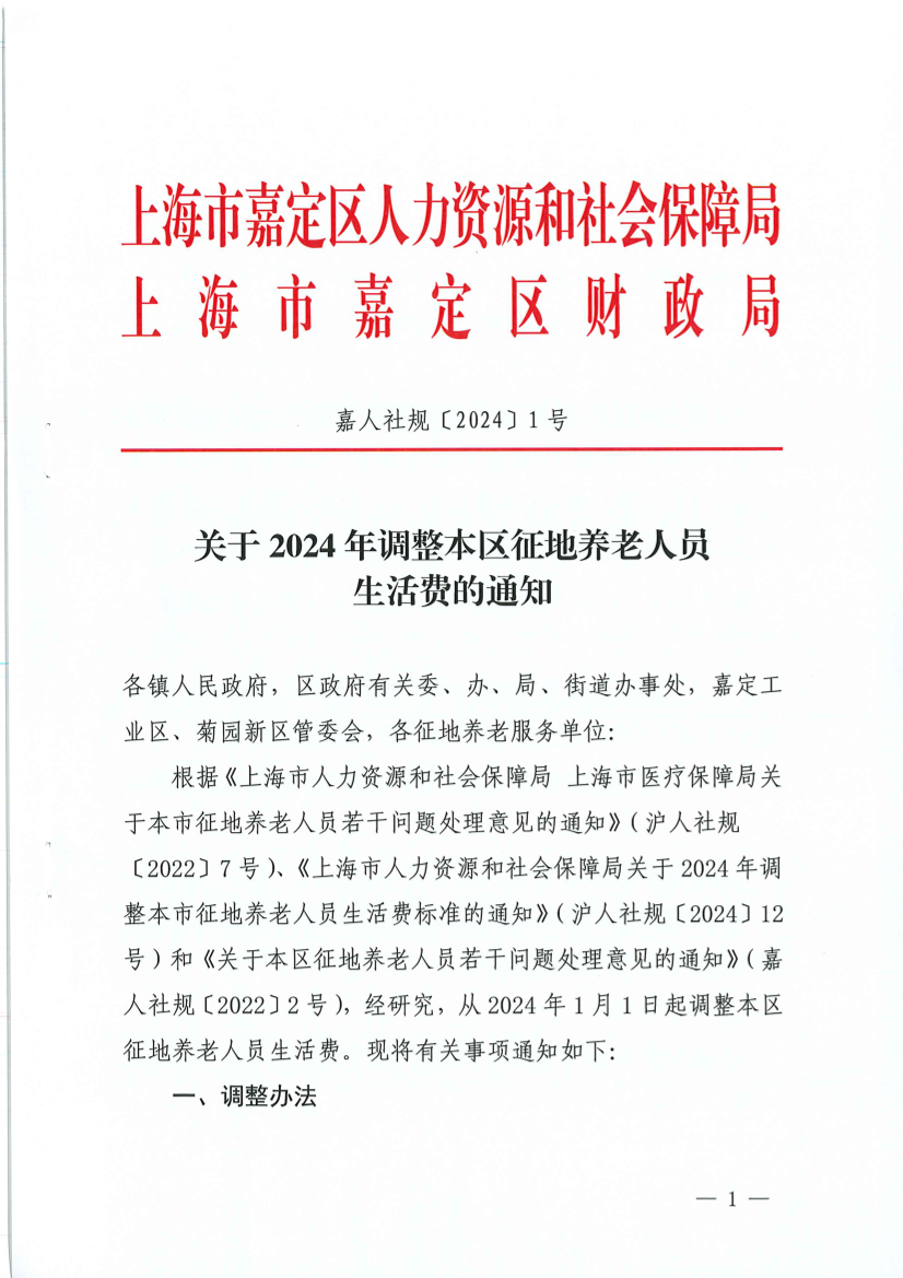 根据《上海市人力资源和社会保障局 上海 市医疗保障局关于本市征地养老人员若干问题处理意见的通知》(沪人社规〔2022〕7号)、《上海市人力资源和社会保障局关于2024年调整本市征地养老人员生活费标准的通知》(沪人社规〔2024〕12号)和《关于本区征地养老人员若干问题处理意见的通知》(嘉人社规〔2022〕2号),经研究,从2024年1月1日起调整本区征地养老人员生活费。现将有关事项通知如下: