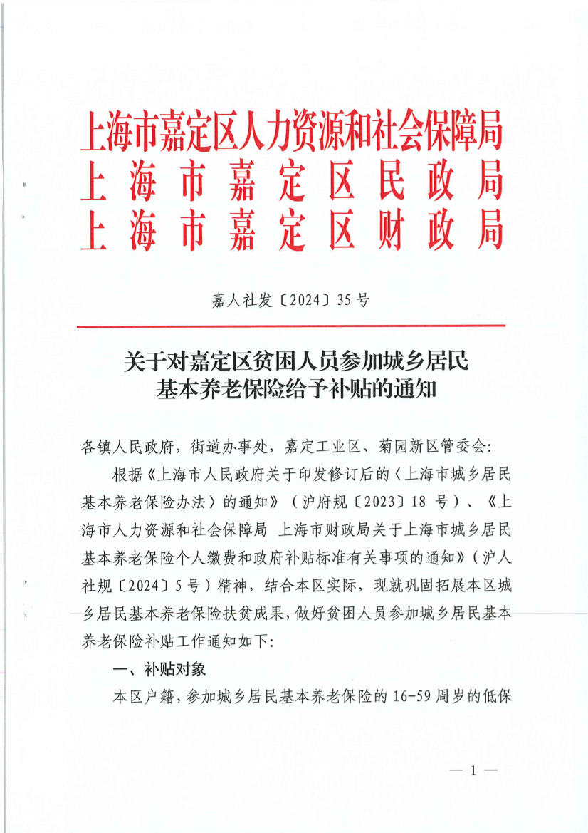 根据《上海市人民政府关于印发修订后的〈上海市城乡居民基本养老保险办法〉的通知》(沪府规〔2023〕18号)、《上海市人力资源和社会保障局 上海市财政局关于上海市城乡居民基本养老保险个人缴费和政府补贴标准有关事项的通知》(沪人社规〔2024〕5号)精神,结合本区实际,现就巩固拓展本区城乡居民基本养老保险扶贫成果,做好贫困人员参加城乡居民基本养老保险补贴工作通知如下: