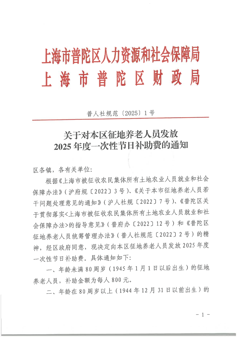 根据《上海市被征收农民集体所有土地农业人员就业和社会保障办法》(沪府规〔2022〕3号)、《关于本市征地养老人员若干问题处理意见的通知》(沪人社规〔2022〕7号)、《普陀区关于贯彻落实<上海市被征收农民集体所有土地农业人员就业和社会保障办法>的指导意见》(普府办〔2022〕12号)和《普陀区征地养老人员统筹管理办法》(普人社规范〔2022〕2号)的精神,经区政府同意,现决定向本区征地养老人员发放2025年度一次性节日补助费。具体通知如下: