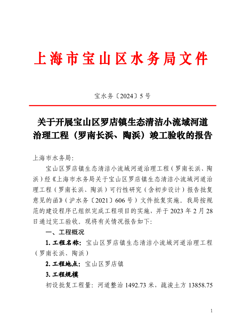 宝山区罗店镇生态清洁小流域河道治理工程(罗南长浜、陶浜)经《上海市水务局关于宝山区罗店镇生态清洁小流域河道治理工程(罗南长浜、陶浜)可行性研究(含初步设计)报告批复意见的函》(沪水务〔2021〕606号)文件批复实施。我局按规范的建设程序已组织完成工程项目的实施,并于2023年2月28日通过完工验收。现将有关情况报告如下: