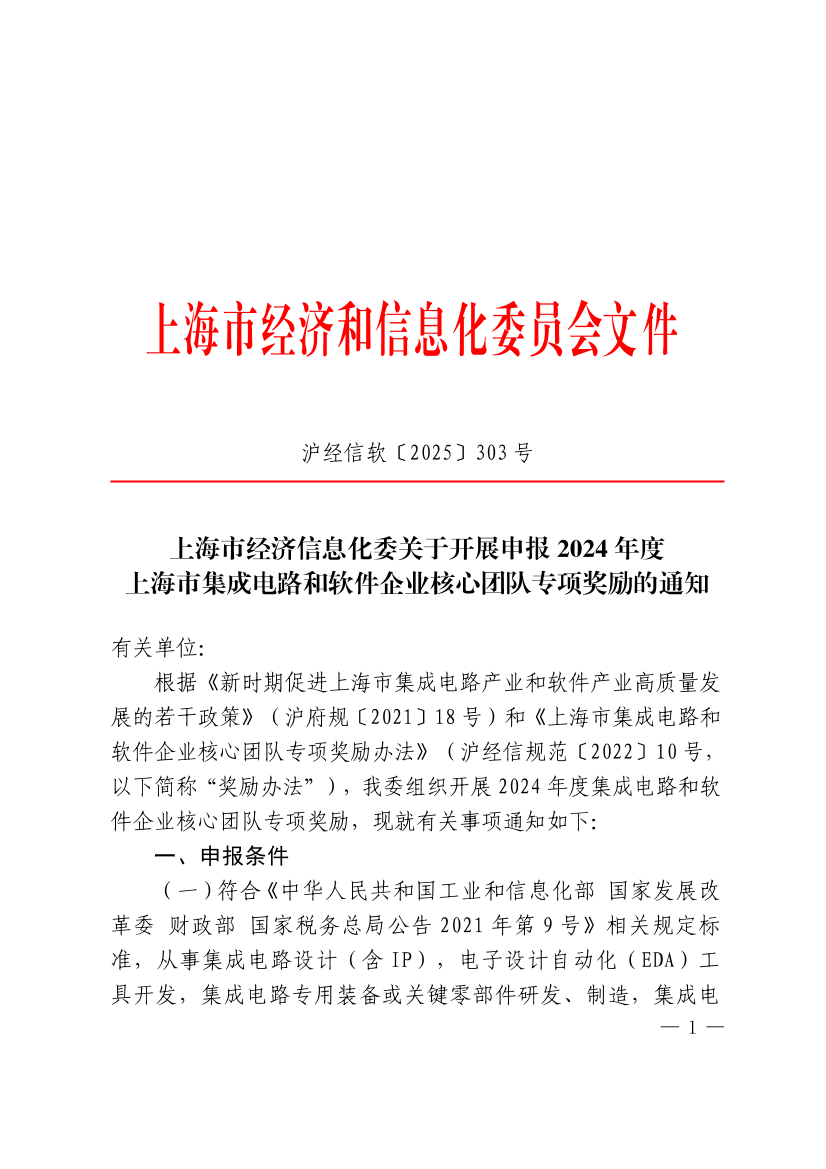 根据《新时期促进上海市集成电路产业和软件产业高质量发展的若干政策》(沪府规〔2021〕18号)和《上海市集成电路和软件企业核心团队专项奖励办法》(沪经信规范〔2022〕10号,以下简称“奖励办法”),我委组织开展2024年度集成电路和软件企业核心团队专项奖励,现就有关事项通知如下: