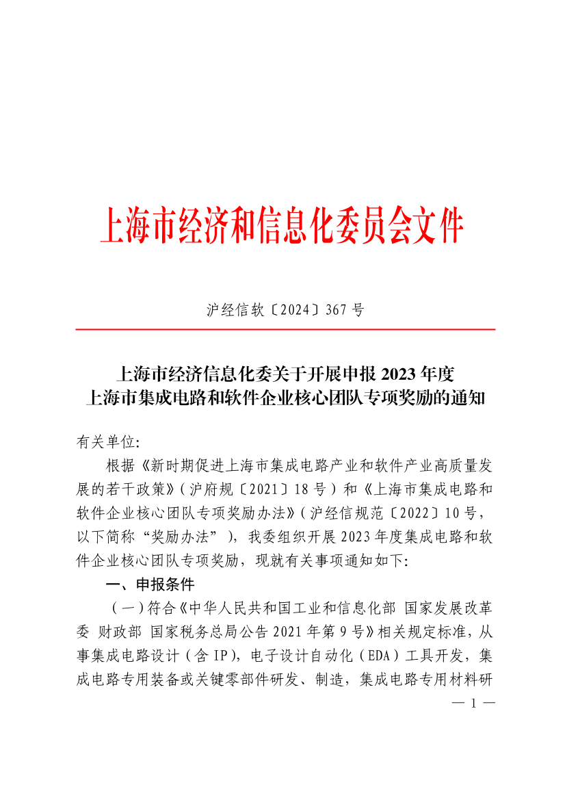 根据《新时期促进上海市集成电路产业和软件产业高质量发展的若干政策》(沪府规〔2021〕18号)和《上海市集成电路和软件企业核心团队专项奖励办法》(沪经信规范〔2022〕10号,以下简称“奖励办法”),我委组织开展2023年度集成电路和软件企业核心团队专项奖励,现就有关事项通知如下: