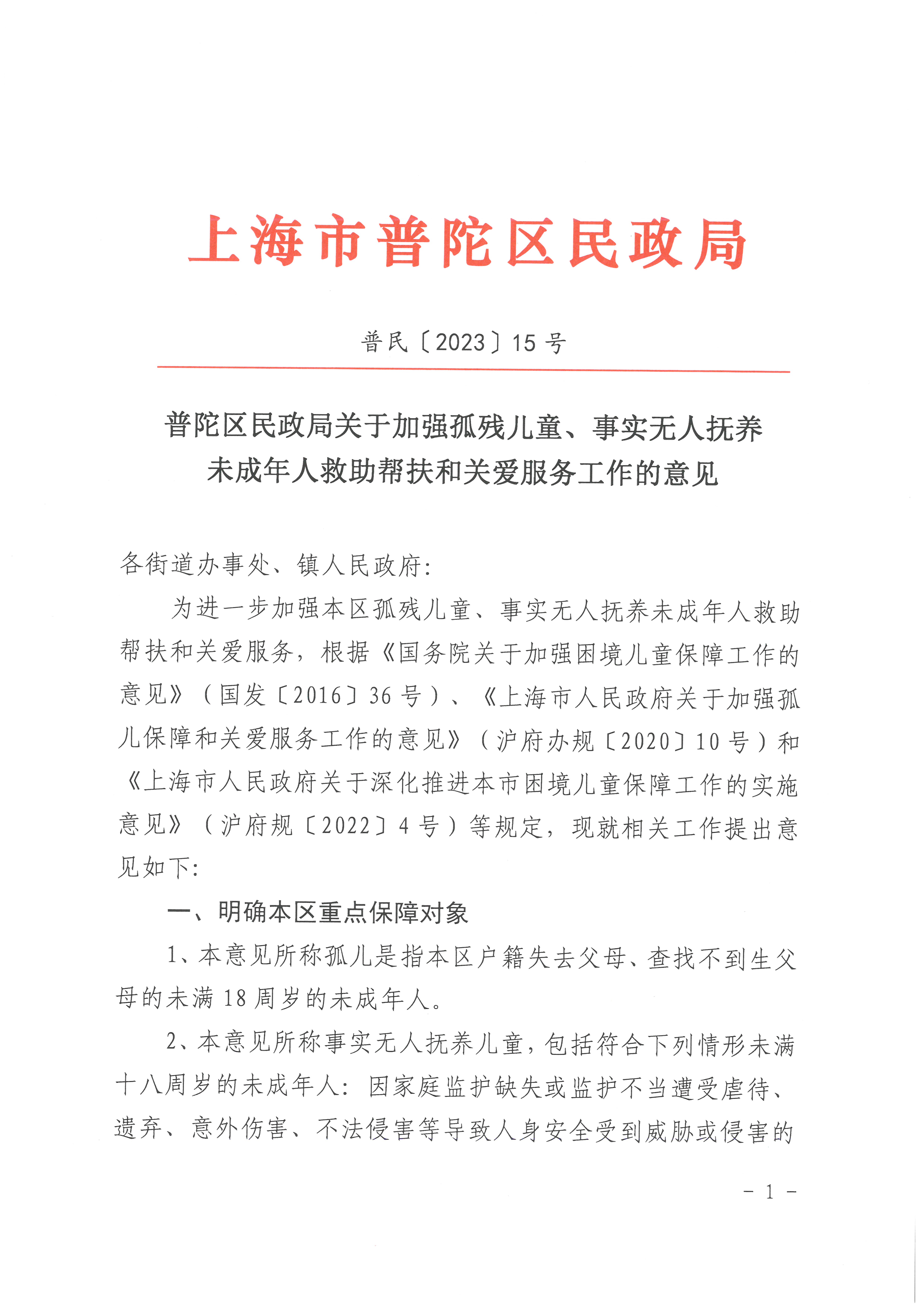 为进一步加强本区孤残儿童、事实无人抚养未成年人救助帮扶和关爱服务,根据《国务院关于加强困境儿童保障工作的意见》(国发〔2016〕36号)、《上海市人民政府关于加强孤儿保障和关爱服务工作的意见》(沪府办规〔2020〕10号)和《上海市人民政府关于深化推进本市困境儿童保障工作的实施意见》(沪府规〔2022〕4号)等规定,现就相关工作提出意见如下: