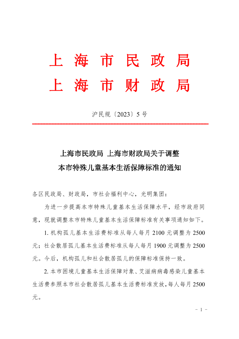 以上标准自2023年6月1日起实施,《上海市民政局、上海市财政局关于调整本市孤儿、困境儿童等基本生活保障标准的通知》(沪民规〔2019〕11号)同步废止。