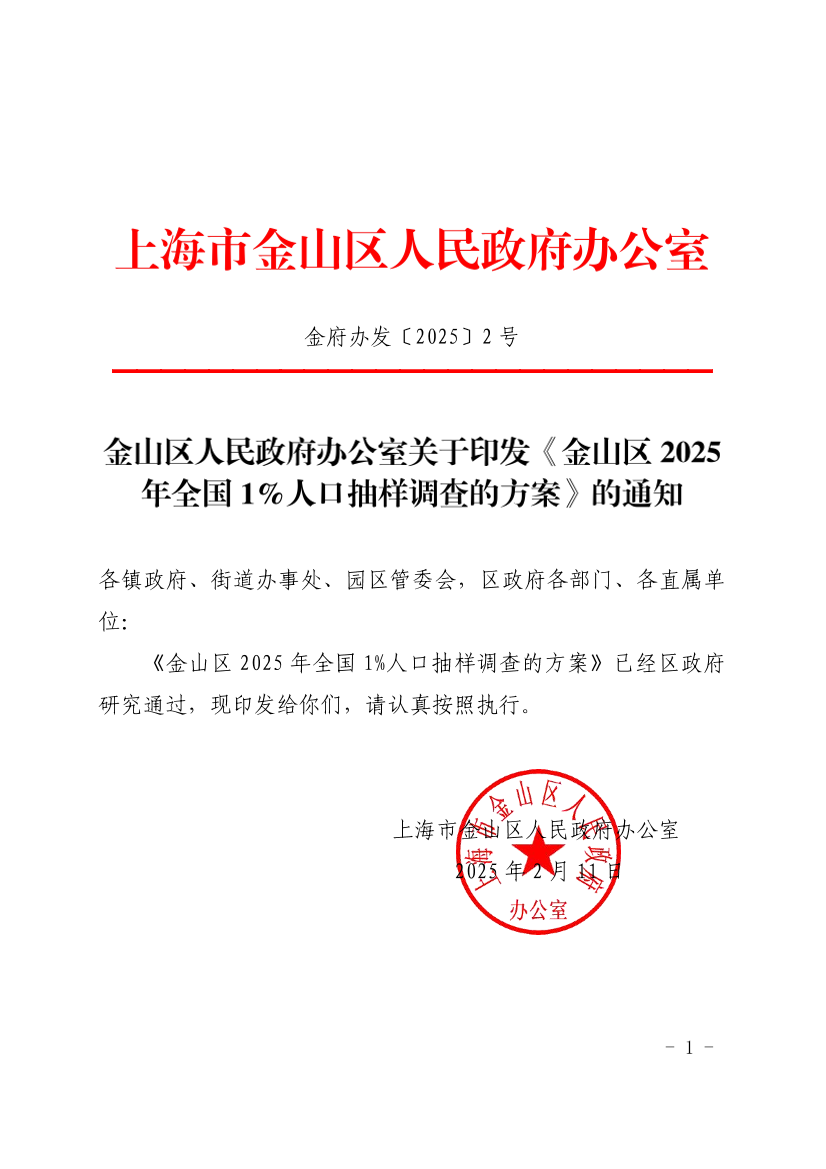 《金山区2025年全国1%人口抽样调查的方案》已经区政府研究通过,现印发给你们,请认真按照执行。