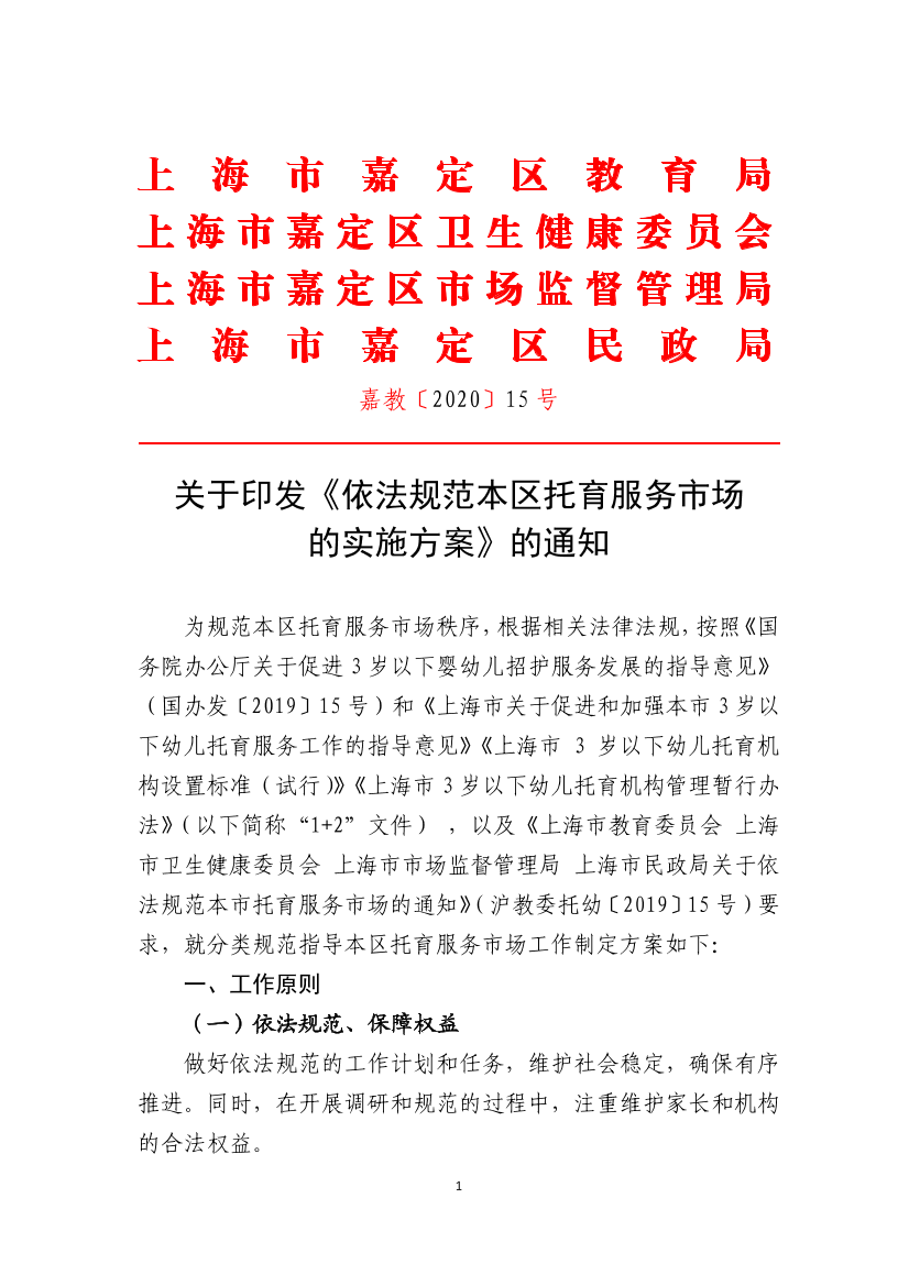 为规范本区托育服务市场秩序,根据相关法律法规,按照《国务院办公厅关于促进3岁以下婴幼儿招护服务发展的指导意见》(国办发〔2019〕15号)和《上海市关于促进和加强本市3岁以下幼儿托育服务工作的指导意见》《上海市3岁以下幼儿托育机构设置标准(试行)》《上海市3岁以下幼儿托育机构管理暂行办法》(以下简称“1+2”文件) ,以及《上海市教育委员会 上海市卫生健康委员会 上海市市场监督管理局 上海市民政局关于依法规范本市托育服务市场的通知》(沪教委托幼〔2019〕15号)要求,就分类规范指导本区托育服务市场工作制定方案如下: