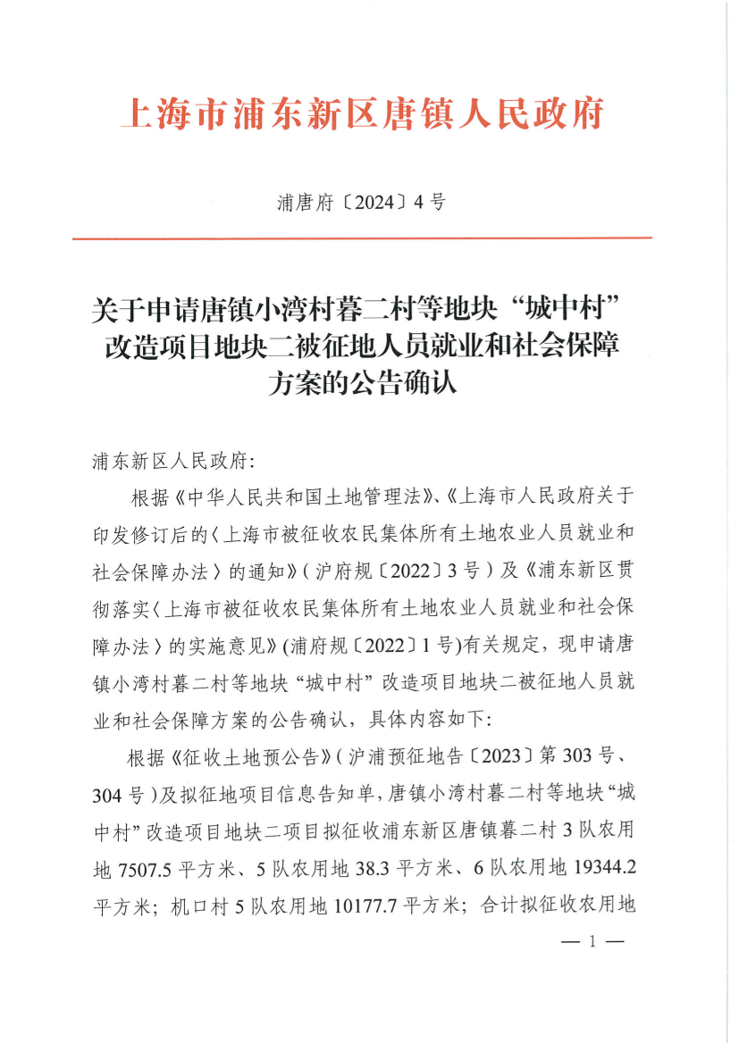 根据《中华人民共和国土地管理法》、《上海市人民政府关于印发修订后的〈上海市被征收农民集体所有土地农业人员就业和社会保障办法〉的通知》(沪府规〔2022〕3号)及《浦东新区贯彻落实〈上海市被征收农民集体所有土地农业人员就业和社会保障办法〉的实施意见》(浦府规〔2022〕1号)有关规定,现申请唐镇小湾村暮二村等地块“城中村”改造项目地块二被征地人员就业和社会保障方案的公告确认,具体内容如下: