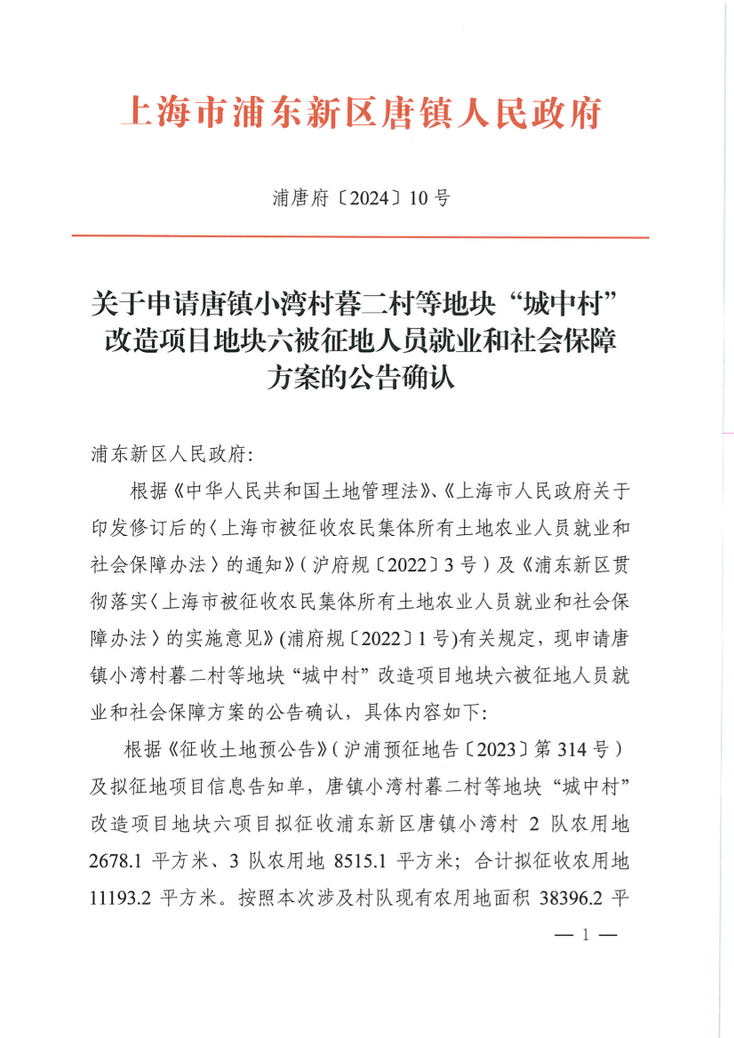 根据《中华人民共和国土地管理法》、《上海市人民政府关于印发修订后的〈上海市被征收农民集体所有土地农业人员就业和社会保障办法〉的通知》(沪府规〔2022〕3号)及《浦东新区贯彻落实〈上海市被征收农民集体所有土地农业人员就业和社会保障办法〉的实施意见》(浦府规〔2022〕1号)有关规定,现申请唐镇小湾村暮二村等地块“城中村”改造项目地块六被征地人员就业和社会保障方案的公告确认,具体内容如下: