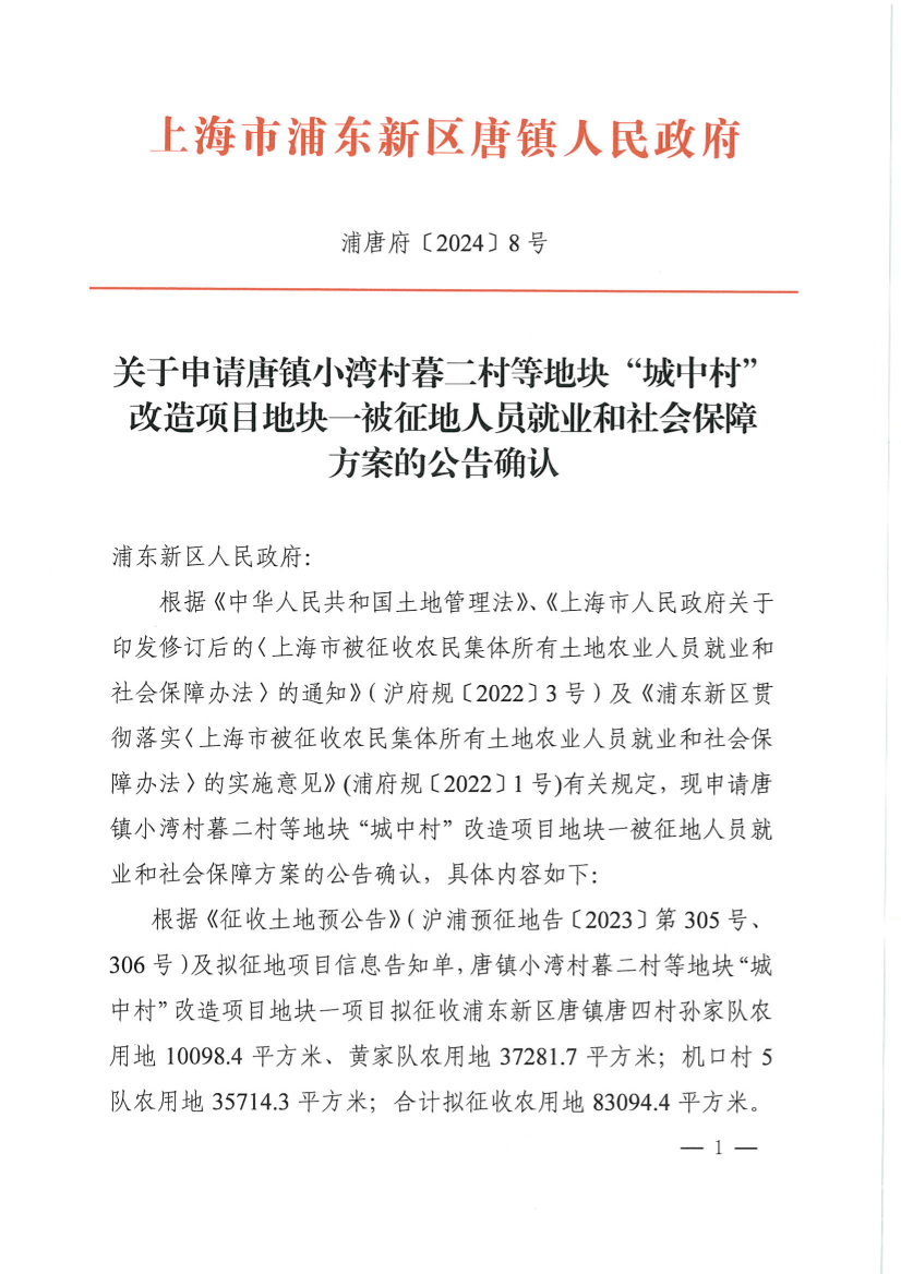 根据《征收土地预公告》(沪浦预征地告〔2023〕第305号、306号)及拟征地项目信息告知单,唐镇小湾村暮二村等地块“城中村”改造项目地块一项目拟征收浦东新区唐镇唐四村孙家队农用地10098.4平方米、黄家队农用地37281.7平方米;机口村5队农用地35714.3平方米;合计拟征收农用地83094.4平方米。按照本次涉及村队现有农用地面积186073.5平方米,年满16周岁以上农业人员共159人,实际申请办理77名被征地人员纳入落实就业和社会保障范围。