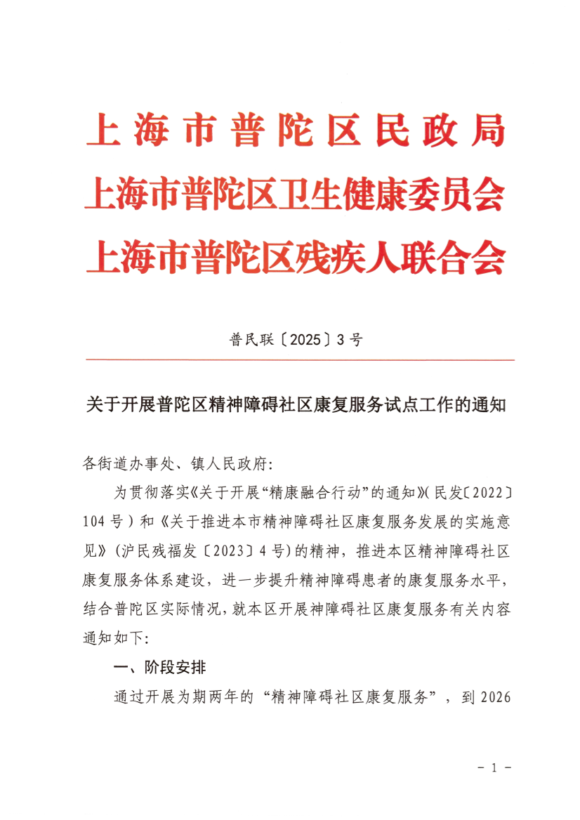 为贯彻落实《关于开展“精康融合行动”的通知》(民发〔2022〕104号)和《关于推进本市精神障碍社区康复服务发展的实施意见》(沪民残福发〔2023〕4号)的精神,推进本区精神障碍社区康复服务体系建设,进一步提升精神障碍患者的康复服务水平,结合普陀区实际情况,就本区开展神障碍社区康复服务有关内容通知如下: