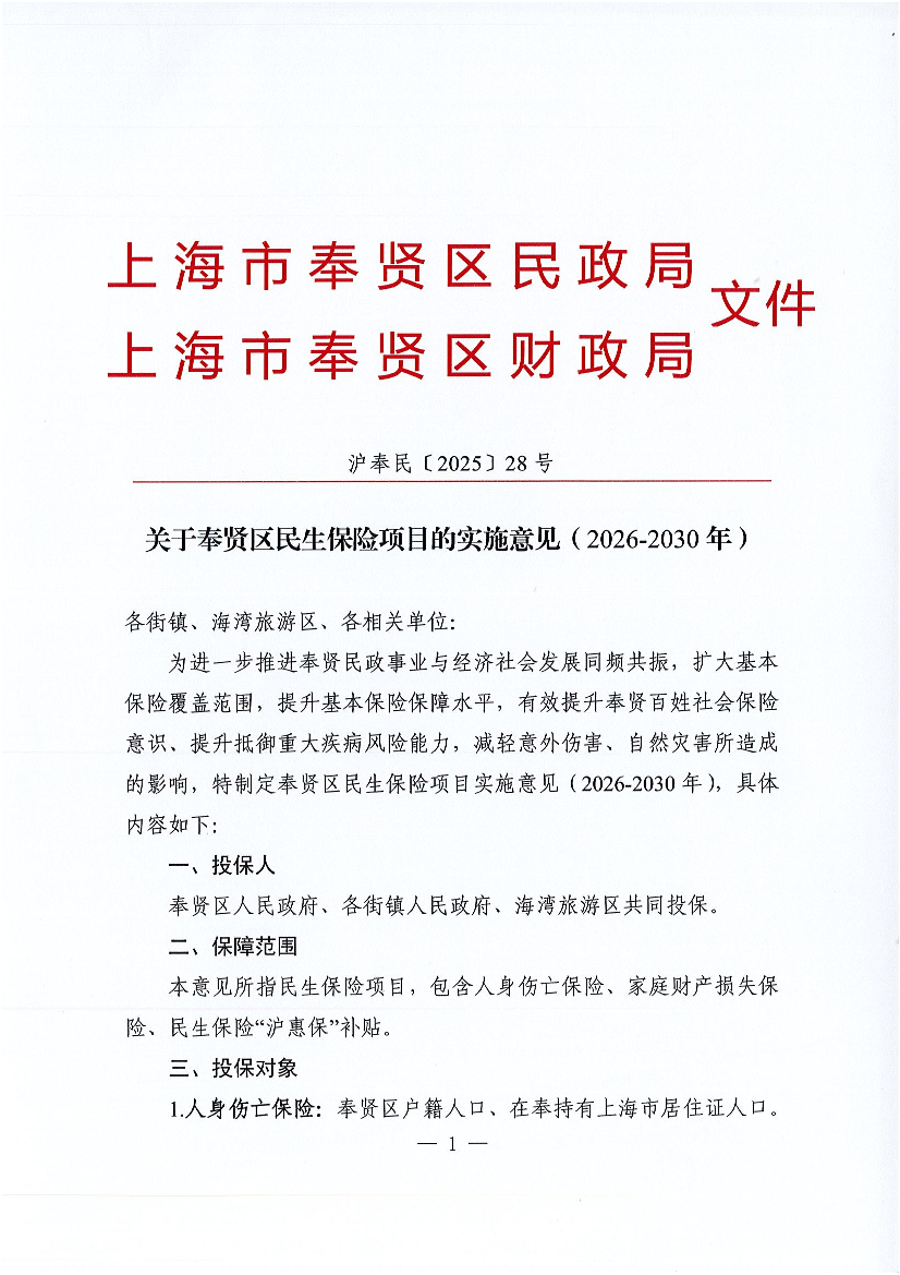 为进一步推进奉贤民政事业与经济社会发展同频共振,扩大基本保险覆盖范围,提升基本保险保障水平,有效提升奉贤百姓社会保险意识、提升抵御重大疾病风险能力,减轻意外伤害、自然灾害所造成的影响,特制定奉贤区民生保险项目实施意见(2026-2030年),具体内容如下: