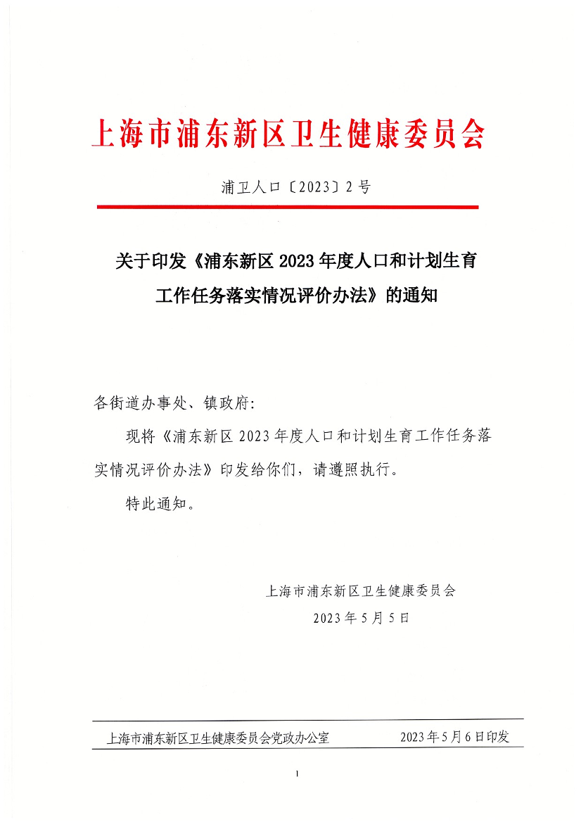 关于印发《浦东新区2023年度人口和计划生育工作任务落实情况评价办法》的通知