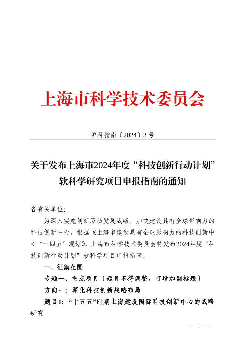 关于发布上海市2024年度“科技创新行动计划”软科学研究项目申报指南的通知
