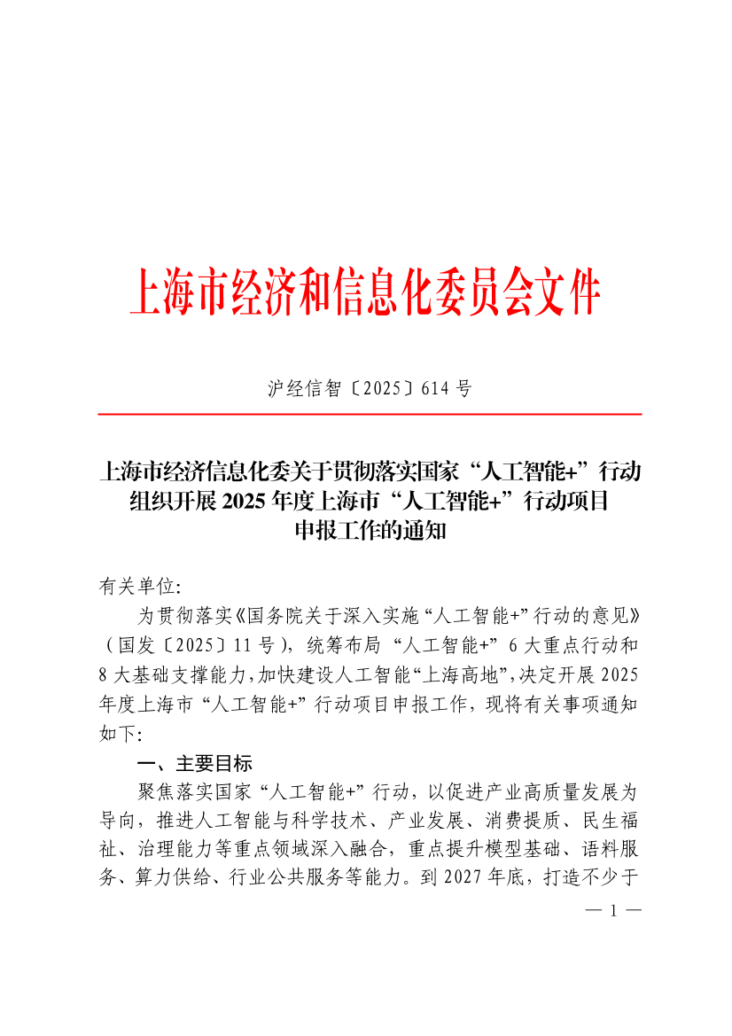 为贯彻落实《国务院关于深入实施“人工智能+”行动的意见》(国发〔2025〕11号),统筹布局“人工智能+”6大重点行动和8大基础支撑能力,加快建设人工智能“上海高地”,决定开展2025年度上海市“人工智能+”行动项目申报工作,现将有关事项通知如下: