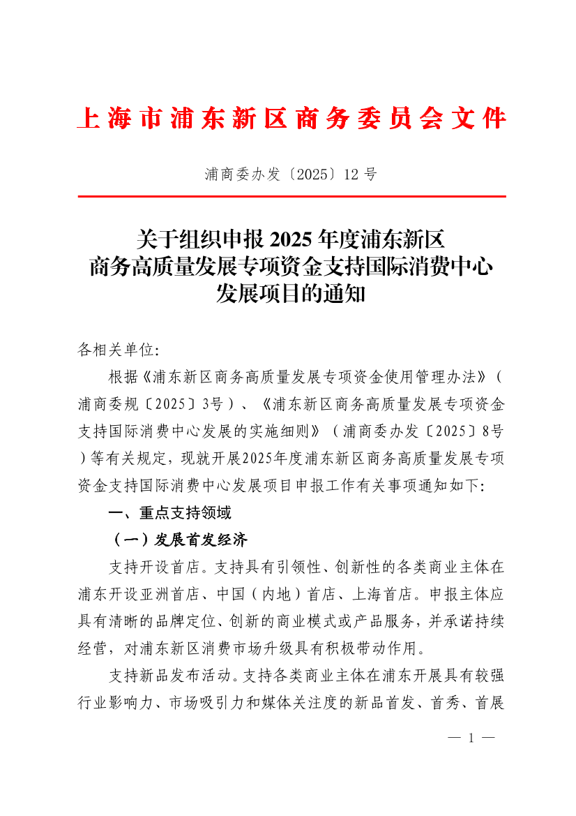 根据《浦东新区商务高质量发展专项资金使用管理办法》(浦商委规〔2025〕3号)、《浦东新区商务高质量发展专项资金支持国际消费中心发展的实施细则》(浦商委办发〔2025〕8号)等有关规定,现就开展2025年度浦东新区商务高质量发展专项资金支持国际消费中心发展项目申报工作有关事项通知如下: