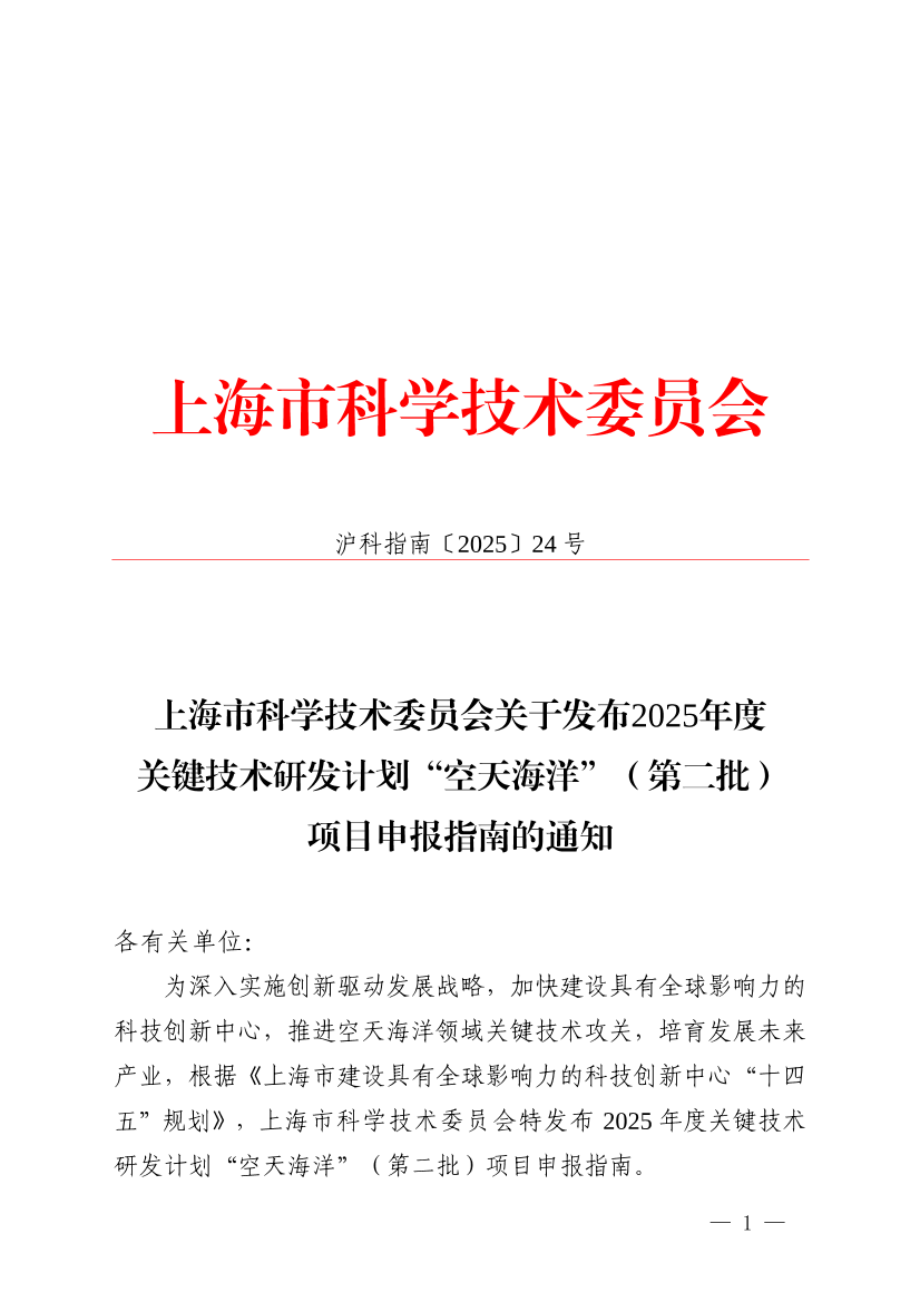 为深入实施创新驱动发展战略,加快建设具有全球影响力的科技创新中心,推进空天海洋领域关键技术攻关,培育发展未来产业,根据《上海市建设具有全球影响力的科技创新中心“十四五”规划》,上海市科学技术委员会特发布2025年度关键技术研发计划“空天海洋”(第二批)项目申报指南。