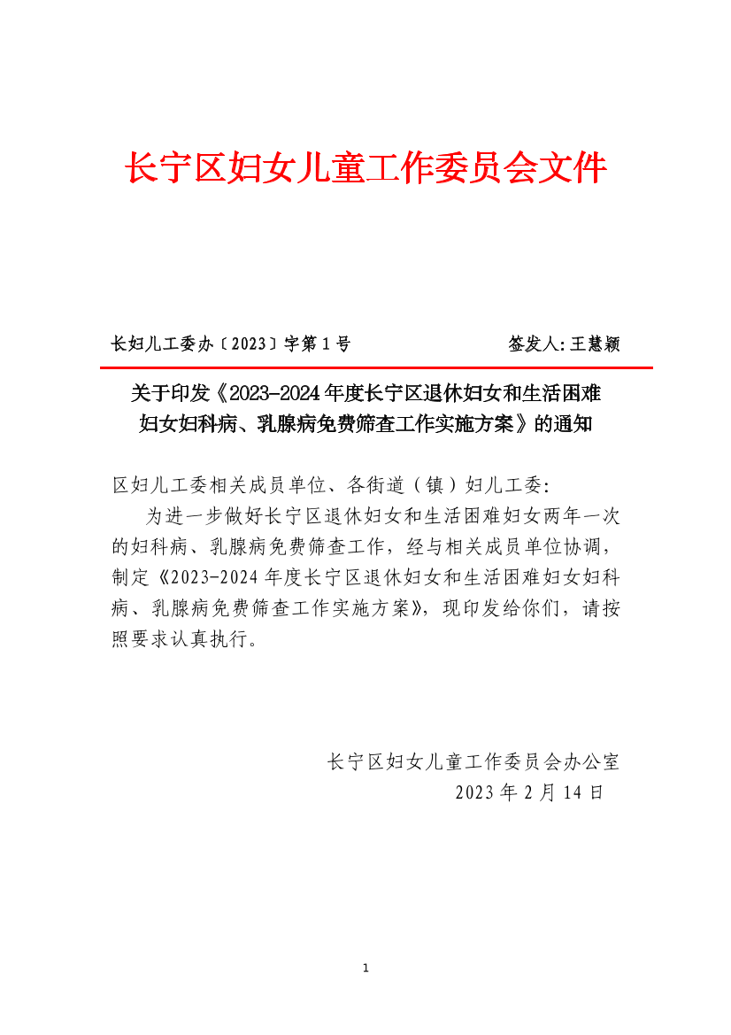 关于印发《2023-2024年度长宁区退休妇女和生活困难妇女妇科病、乳腺病免费筛查工作实施方案》的通知