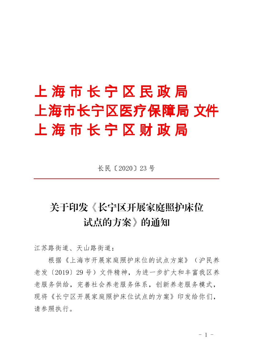 关于印发《长宁区开展家庭照护床位试点的方案》的通知