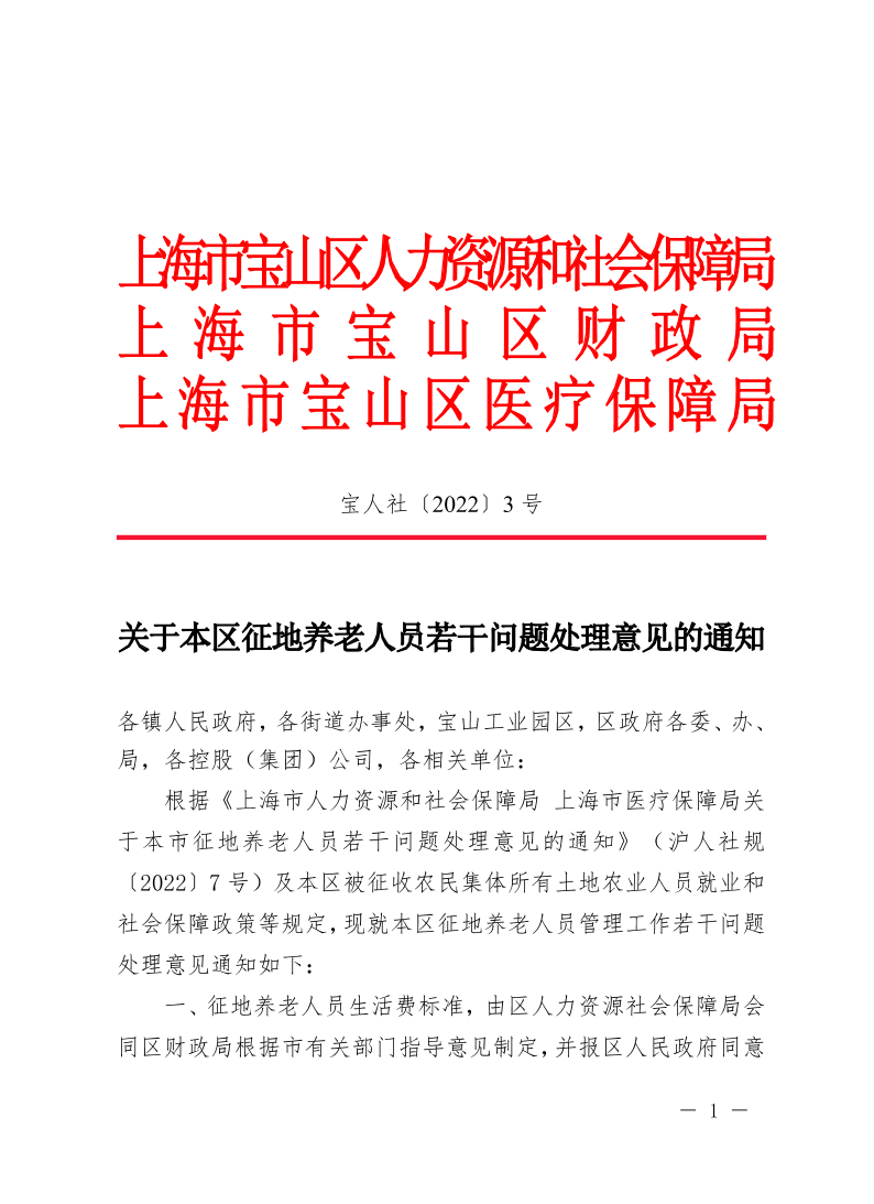 根据《上海市人力资源和社会保障局 上海市医疗保障局关于本市征地养老人员若干问题处理意见的通知》(沪人社规〔2022〕7号)及本区被征收农民集体所有土地农业人员就业和社会保障政策等规定,现就本区征地养老人员管理工作若干问题处理意见通知如下: