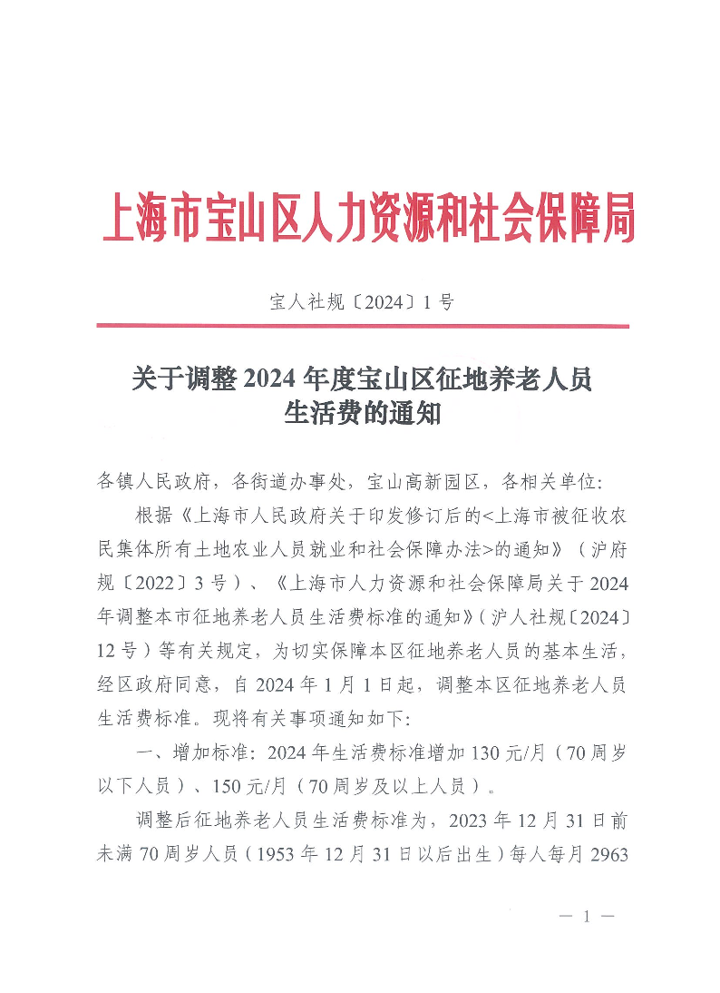 根据《上海市人民政府关于印发修订后的<上海市被征收农民集体所有土地农业人员就业和社会保障办法>的通知》(沪府规〔2022〕3号)、《上海市人力资源和社会保障局关于2024年调整本市征地养老人员生活费标准的通知》(沪人社规〔2024〕12号)等有关规定,为切实保障本区征地养老人员的基本生活,经区政府同意,自2024年1月1日起,调整本区征地养老人员生活费标准。现将有关事项通知如下: