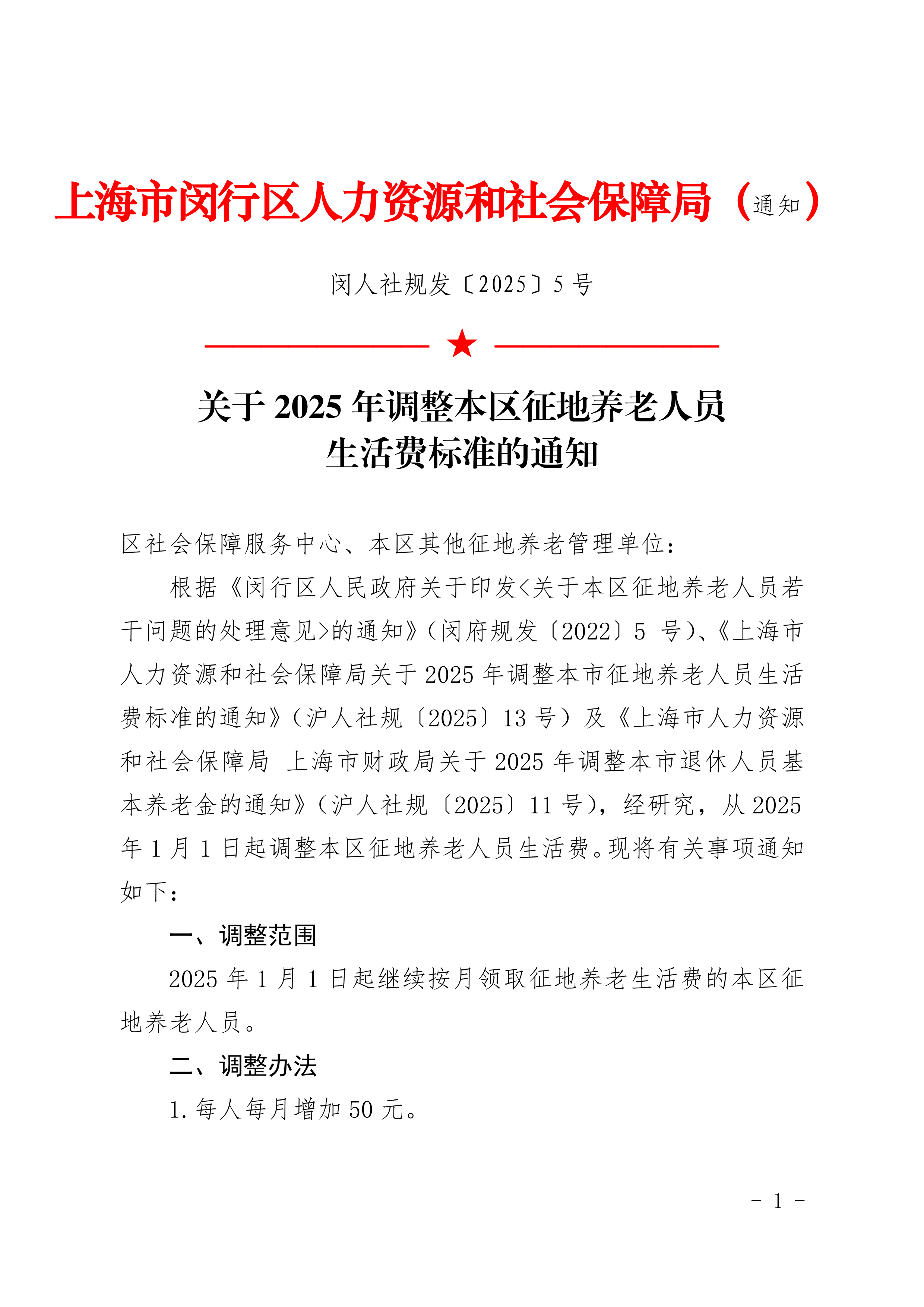 根据《闵行区人民政府关于印发<关于本区征地养老人员若干问题的处理意见>的通知》(闵府规发〔2022〕5 号)、《上海市人力资源和社会保障局关于2025年调整本市征地养老人员生活费标准的通知》(沪人社规〔2025〕13号)及《上海市人力资源和社会保障局 上海市财政局关于2025年调整本市退休人员基本养老金的通知》(沪人社规〔2025〕11号),经研究,从2025年1月1日起调整本区征地养老人员生活费。现将有关事项通知如下: