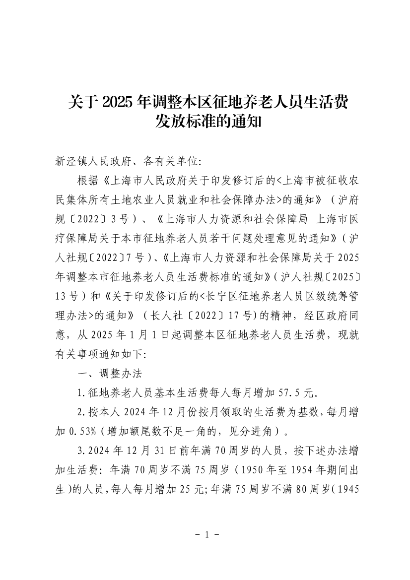 根据《上海市人民政府关于印发修订后的<上海市被征收农民集体所有土地农业人员就业和社会保障办法>的通知》(沪府规〔2022〕3号)、《上海市人力资源和社会保障局 上海市医疗保障局关于本市征地养老人员若干问题处理意见的通知》(沪人社规〔2022〕7号)、《上海市人力资源和社会保障局关于2025年调整本市征地养老人员生活费标准的通知》(沪人社规〔2025〕13号)和《关于印发修订后的<长宁区征地养老人员区级统筹管理办法>的通知》(长人社〔2022〕17号)的精神,经区政府同意,从2025年1月1日起调整本区征地养老人员生活费,现就有关事项通知如下: