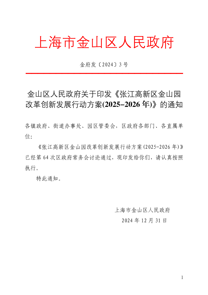 《张江高新区金山园改革创新发展行动方案(2025-2026年)》已经第64次区政府常务会讨论通过,现印发给你们,请认真按照执行。