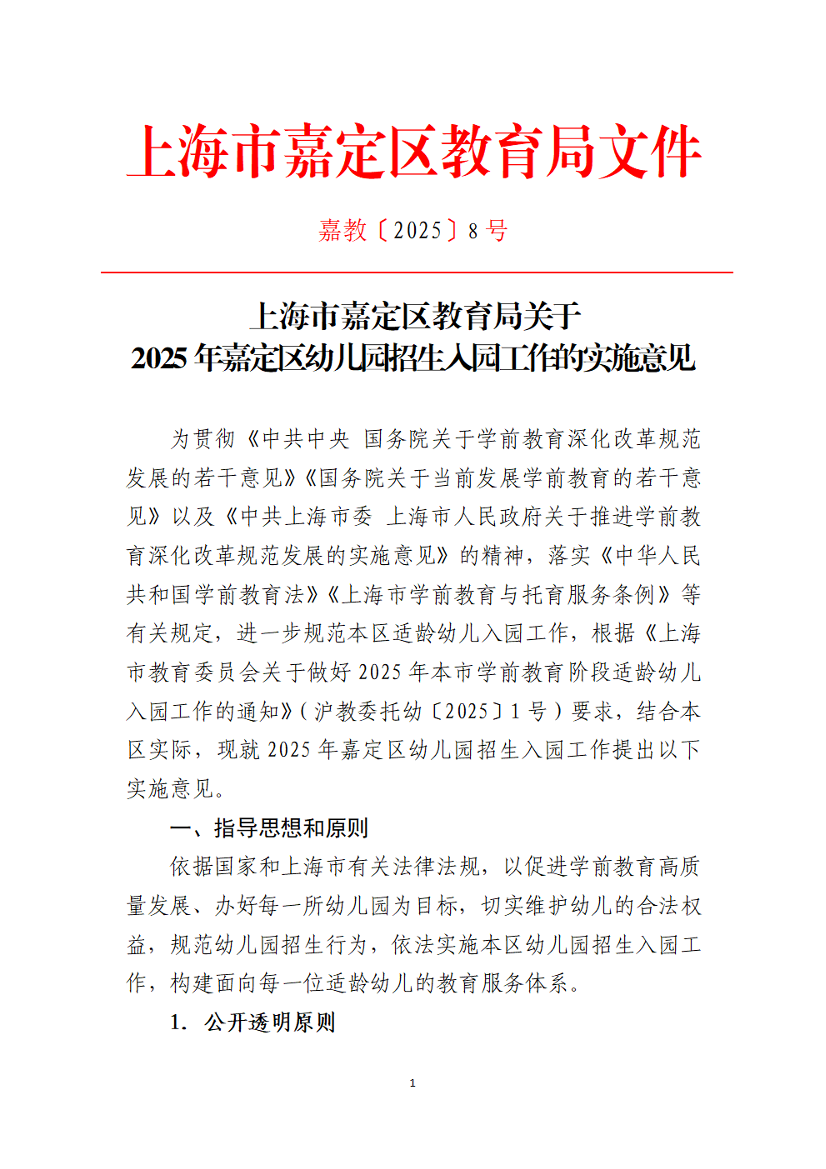 为贯彻《中共中央 国务院关于学前教育深化改革规范发展的若干意见》《国务院关于当前发展学前教育的若干意见》以及《中共上海市委 上海市人民政府关于推进学前教育深化改革规范发展的实施意见》的精神,落实《中华人民共和国学前教育法》《上海市学前教育与托育服务条例》等有关规定,进一步规范本区适龄幼儿入园工作,根据《上海市教育委员会关于做好2025年本市学前教育阶段适龄幼儿入园工作的通知》(沪教委托幼〔2025〕1号)要求,结合本区实际,现就2025年嘉定区幼儿园招生入园工作提出以下实施意见。