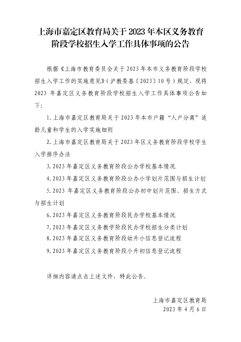 根据《上海市教育委员会关于2023年本市义务教育阶段学校招生入学工作的实施意见》(沪教委基〔2023〕10号)规定,现将2023年嘉定区义务教育阶段学校招生入学工作具体事项公告如下: