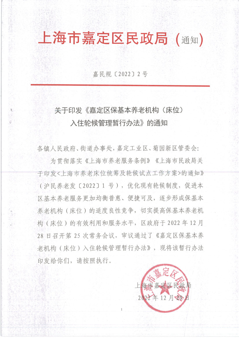 关于印发《嘉定区保基本养老机构(床位)入住轮候管理暂行办法》的通知
