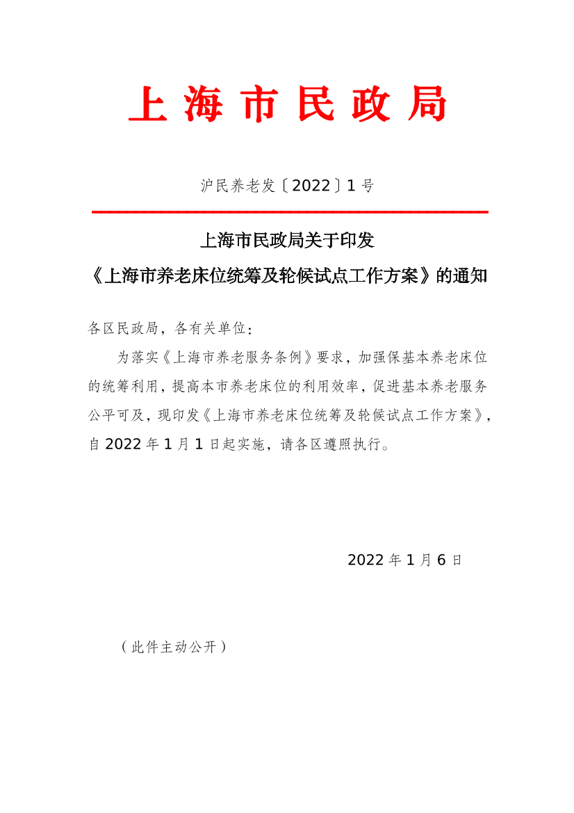为落实《上海市养老服务条例》要求,加强保基本养老床位的统筹利用,提高本市养老床位的利用效率,促进基本养老服务公平可及,现印发《上海市养老床位统筹及轮候试点工作方案》,自2022年1月1日起实施,请各区遵照执行。