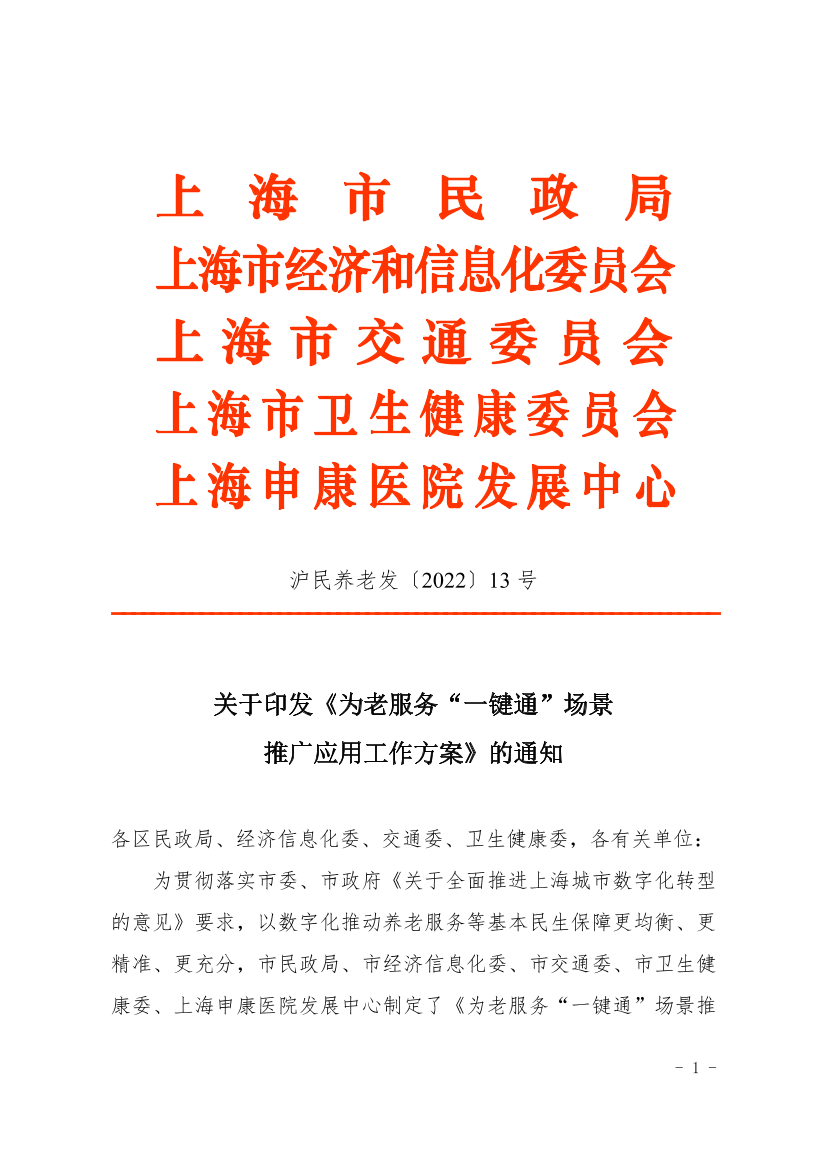 为贯彻落实市委、市政府《关于全面推进上海城市数字化转型的意见》要求,以数字化推动养老服务等基本民生保障更均衡、更精准、更充分,市民政局、市经济信息化委、市交通委、市卫生健康委、上海申康医院发展中心制定了《为老服务“一键通”场景推广应用工作方案》,现印发给你们,请遵照执行,抓好落实。