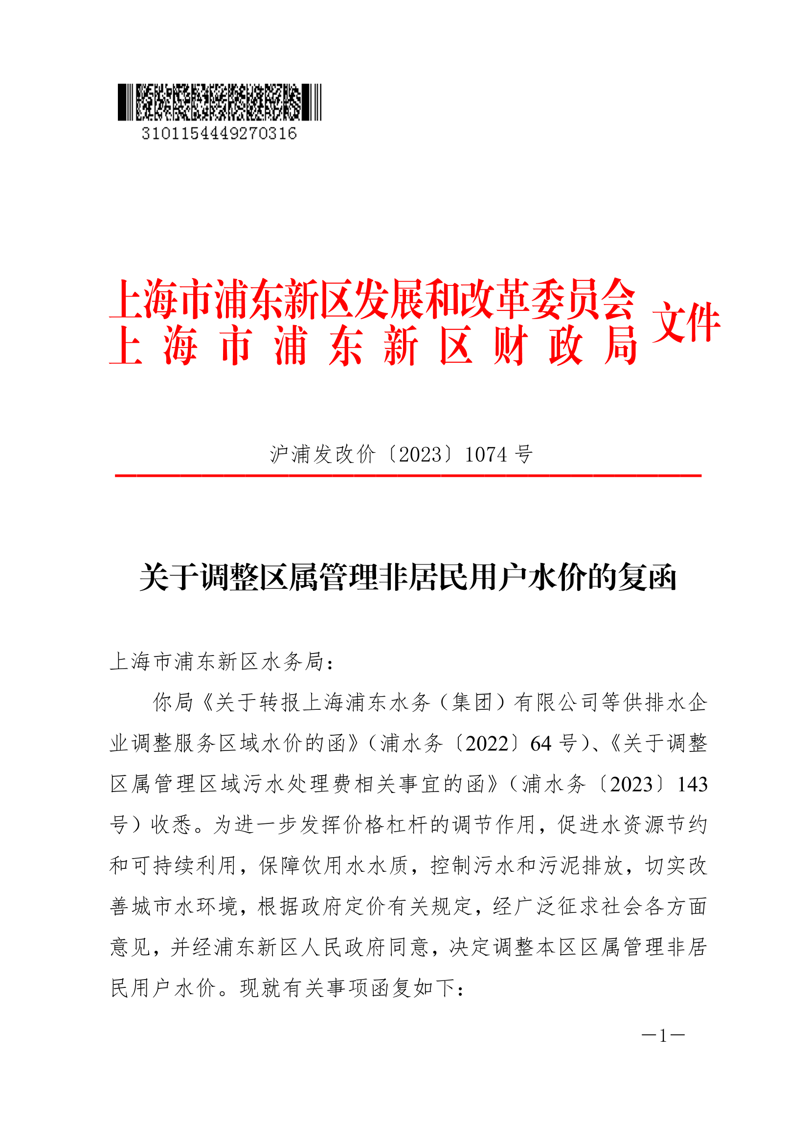 你局《关于转报上海浦东水务(集团)有限公司等供排水企业调整服务区域水价的函》(浦水务〔2022〕64号)、《关于调整区属管理区域污水处理费相关事宜的函》(浦水务〔2023〕143号)收悉。为进一步发挥价格杠杆的调节作用,促进水资源节约和可持续利用,保障饮用水水质,控制污水和污泥排放,切实改善城市水环境,根据政府定价有关规定,经广泛征求社会各方面意见,并经浦东新区人民政府同意,决定调整本区区属管理非居民用户水价。现就有关事项函复如下: