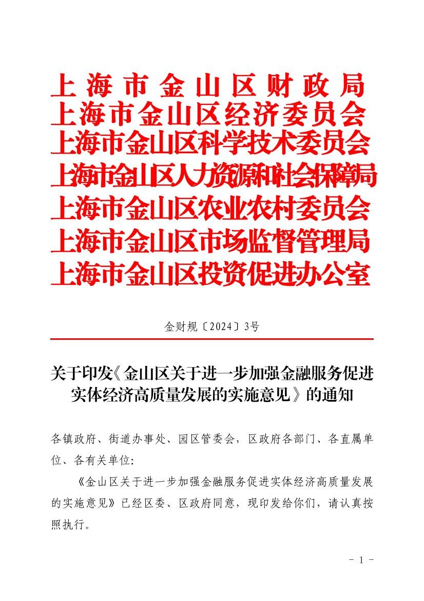 金山区关于进一步加强金融服务促进实体经济高质量发展的实施意见