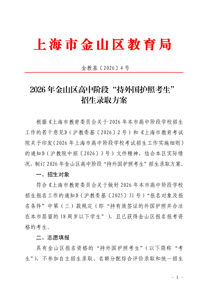 根据《上海市教育委员会关于2026年本市高中阶段学校招生工作的若干意见》(沪教委基〔2026〕2号)和《上海市教育考试院关于印发〈2026年上海市高中阶段学校考试招生工作实施细则〉的通知》(沪教院中招〔2026〕3号)文件精神,结合本区实际情况,制订2026年金山区高中阶段“持外国护照考生”招生录取方案。