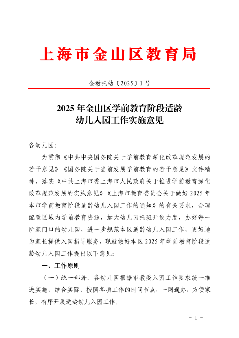 为贯彻《中共中央国务院关于学前教育深化改革规范发展的若干意见》《国务院关于当前发展学前教育的若干意见》文件精神,落实《中共上海市委上海市人民政府关于推进学前教育深化改革规范发展的实施意见》《上海市教育委员会关于做好2025年本市学前教育阶段适龄幼儿入园工作的通知》的有关要求,合理配置区域内学前教育资源,加大幼儿园托班开设力度,办好每一所家门口的幼儿园,进一步规范本区适龄幼儿入园工作,更好地为家长提供入园指导服务,现就做好本区2025年学前教育阶段适龄幼儿入园工作提出以下意见: