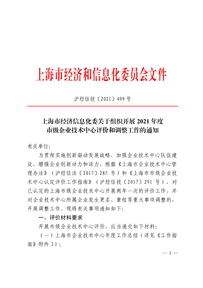为贯彻实施创新驱动发展战略,加强企业技术中心队伍建设,增强企业创新动力和活力,根据《上海市企业技术中心管理办法》(沪经信法〔2017〕285号)和《上海市市级企业技术中心认定评价工作指南》(沪经信技〔2017〕291号),对已认定的上海市级企业技术中心开展两年一次的评价工作,并对企业技术中心所属企业发生更名、重组等重大事项调整的,开展调整工作。现将有关事项通知如下:
