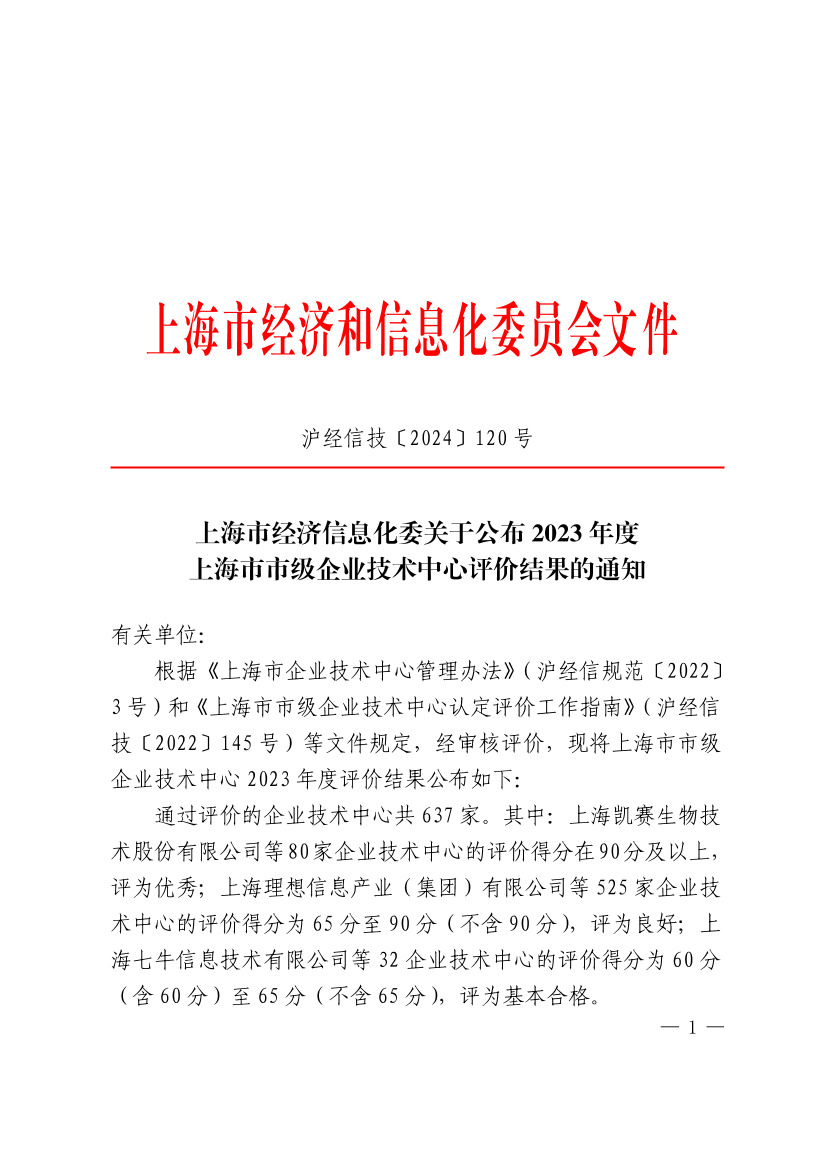 根据《上海市企业技术中心管理办法》(沪经信规范〔2022〕3号)和《上海市市级企业技术中心认定评价工作指南》(沪经信技〔2022〕145号)等文件规定,经审核评价,现将上海市市级企业技术中心2023年度评价结果公布如下: