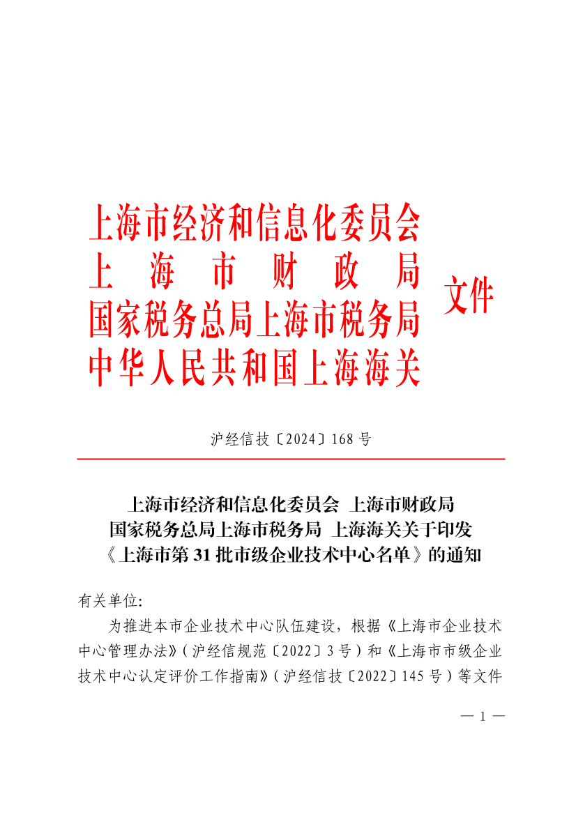为推进本市企业技术中心队伍建设,根据《上海市企业技术中心管理办法》(沪经信规范〔2022〕3号)和《上海市市级企业技术中心认定评价工作指南》(沪经信技〔2022〕145号)等文件规定,经对企业申报材料进行初审以及开展专家评审和综合评估,认定中铁二十四局集团上海铁建工程有限公司等50家企业的技术中心为第31批市级企业技术中心。现将有关名单印发给你们。