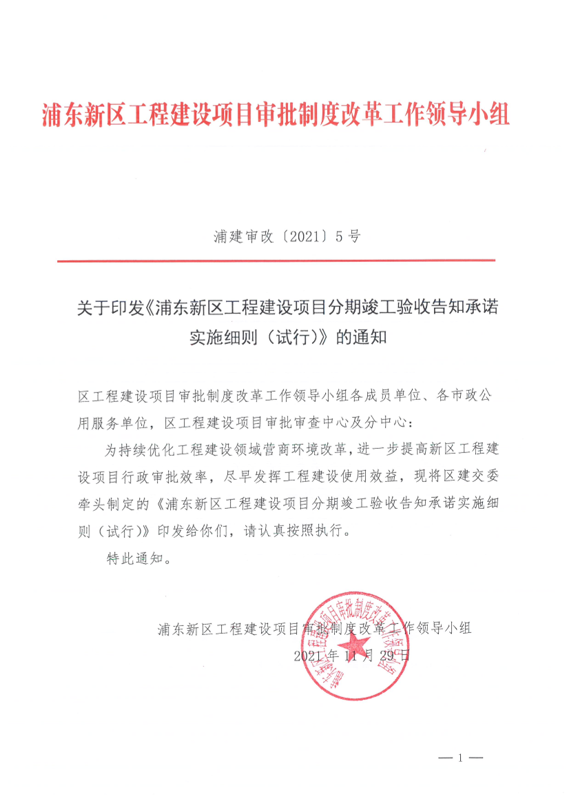 为深化“放管服”改革和优化营商环境,进一步提高浦东新区工程建设项目行政审批效率,尽早发挥工程建设项目使用效益,根据《上海市行政审批告知承诺管理办法》《关于进一步深化行政审批制度改革加快推进重大项目建设的若干措施》等文件精神,结合浦东新区综合竣工验收实际,制定本细则。