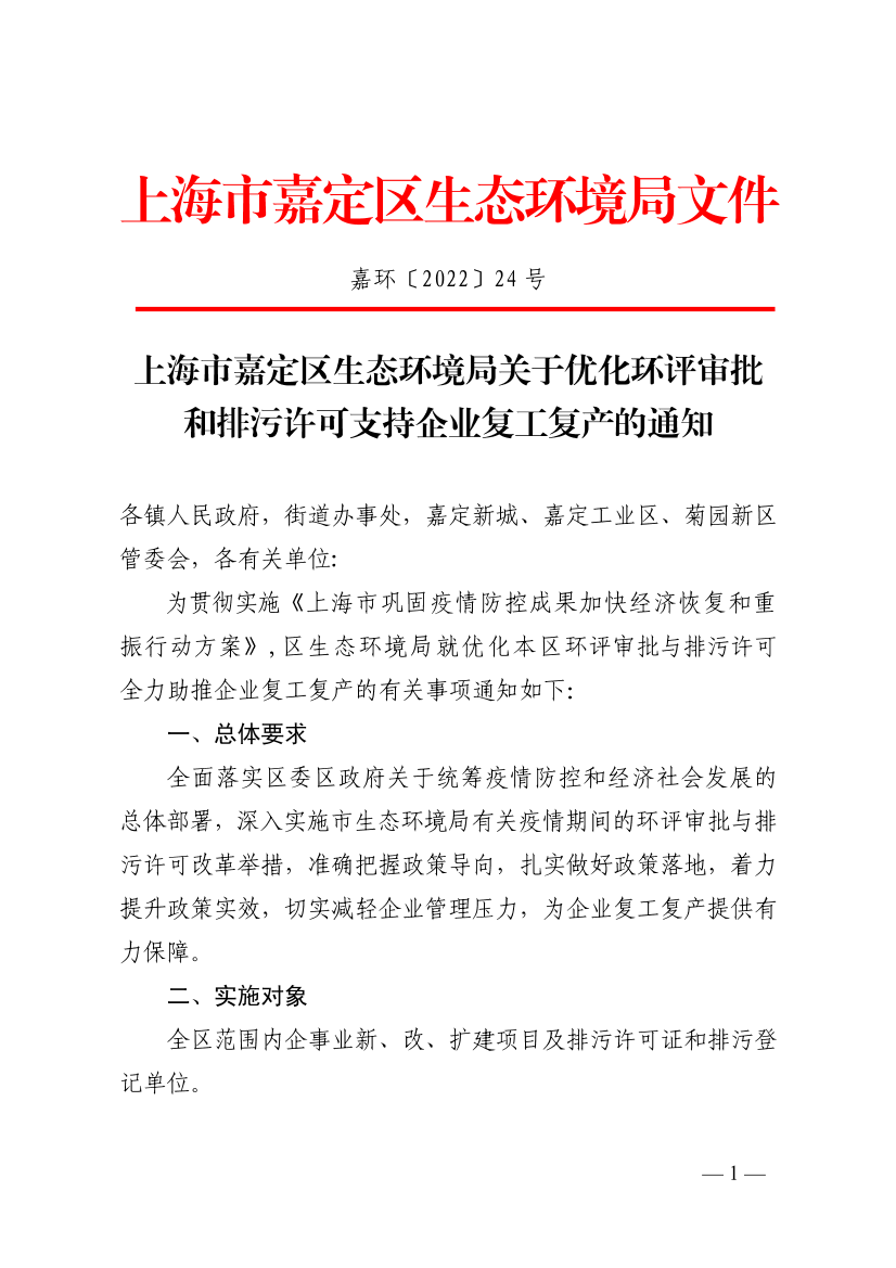 上海市嘉定区生态环境局关于优化环评审批和排污许可支持企业复工复产的通知