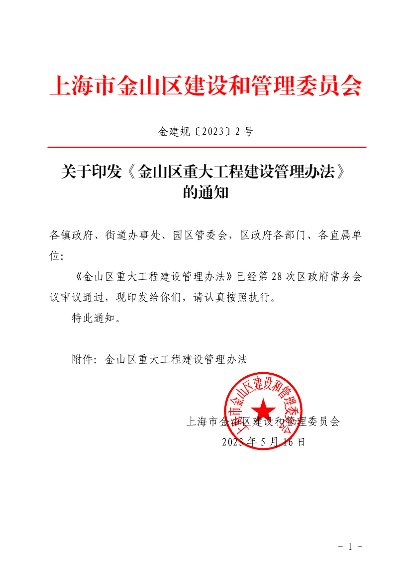 《金山区重大工程建设管理办法》已经第28次区政府常务会议审议通过,现印发给你们,请认真按照执行。